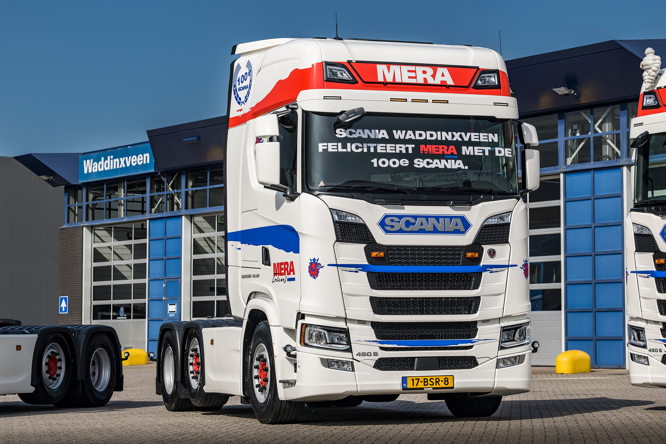 De 100ste Scania is een rondom luchtgeveerde drieassige 450 pk sterke trekker met een 7,5 tons voorloopas en een rijk uitgevoerde S-cabine met een hoog dak. Hij is afgeleverd in een batch van drie stuks. Maar, er kan er maar één de honderdste zijn…
