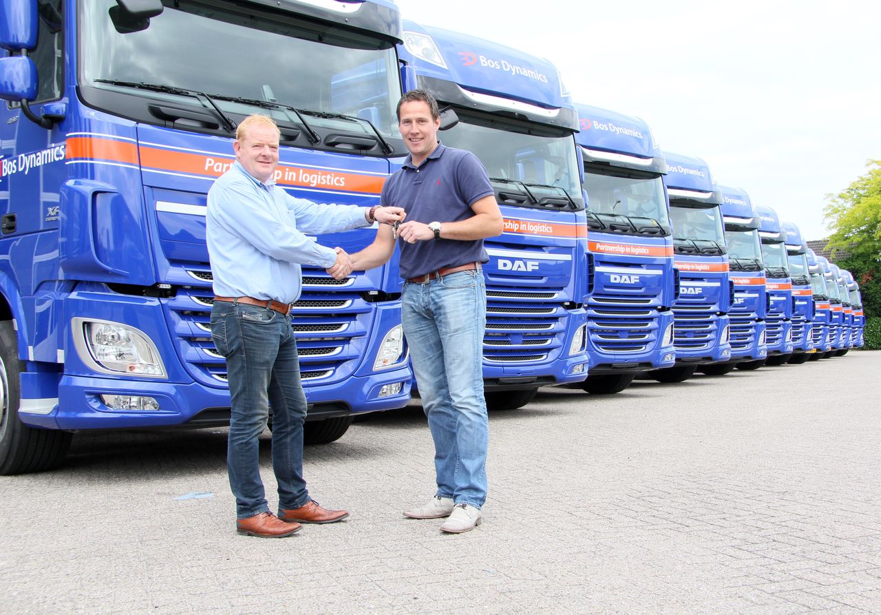 Foto: De twaalf nieuwe DAF’s worden overhandigd aan Cor-Albert Bos, directeur van Bos Dynamics, door Marijn Bos, verkoopleider bij Bakker Bedrijfsgroep.