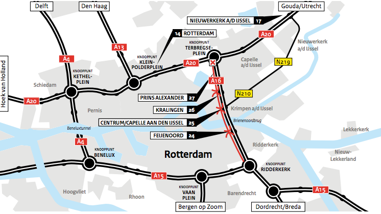 - Parallelrijbaan A16 tussen afrit Centrum/Capelle aan den IJssel (25) en oprit Feijenoord (24).