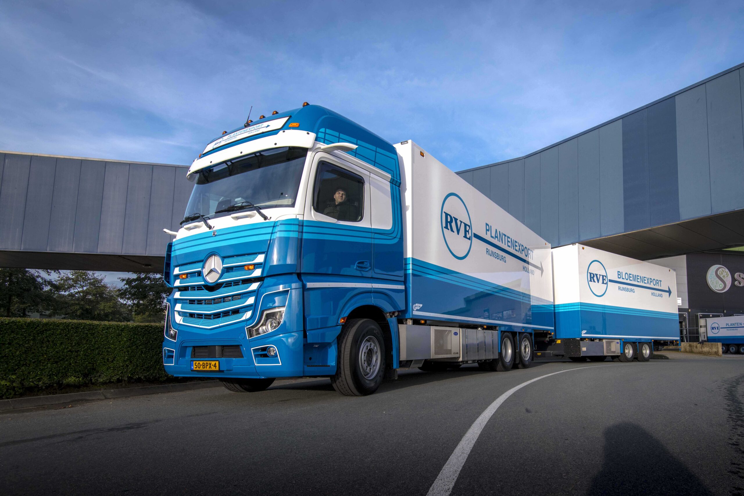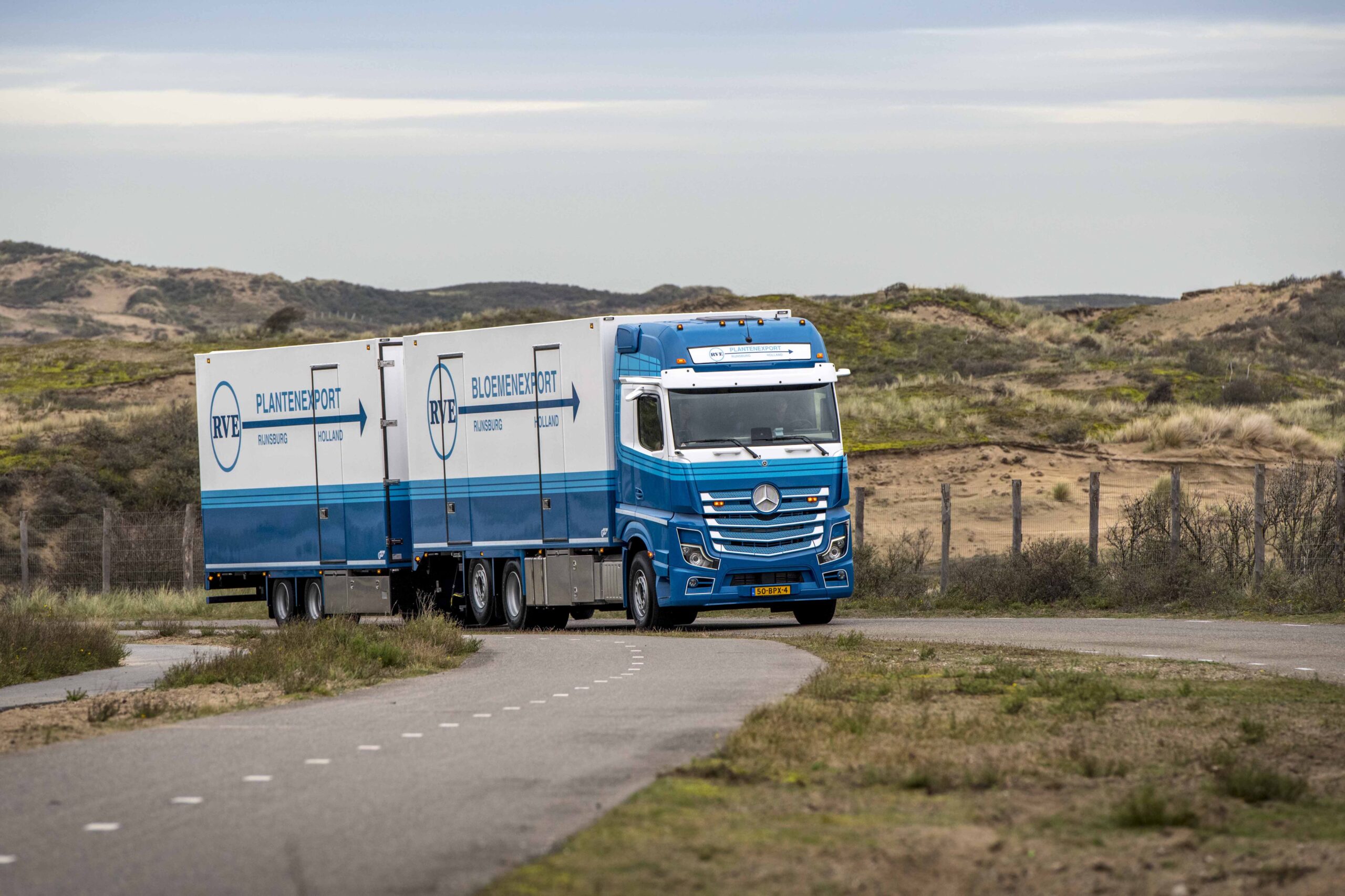 RVE Plantenhandel maakt voor het vervoer van planten en bloemen naar supermarkten in Duitsland gebruik van een gevarieerd wagenpark dat uit meerdere merken bestaat. In relatief korte tijd werden daar twee Mercedes-Benz Actros bakwagens aan toegevoegd. Afgelopen week werd de laatste, een nieuwe Actros 2548 LENA 6×2, in gebruik genomen. De volledig luchtgeveerde bakwagen met gestuurde en hefbare naloopas kreeg de voorkeur vanwege onder meer de innovatieve veiligheidsystemen. Met Active Brake Assist 5 en de MirrorCam is de standaard veiligheid hoog.