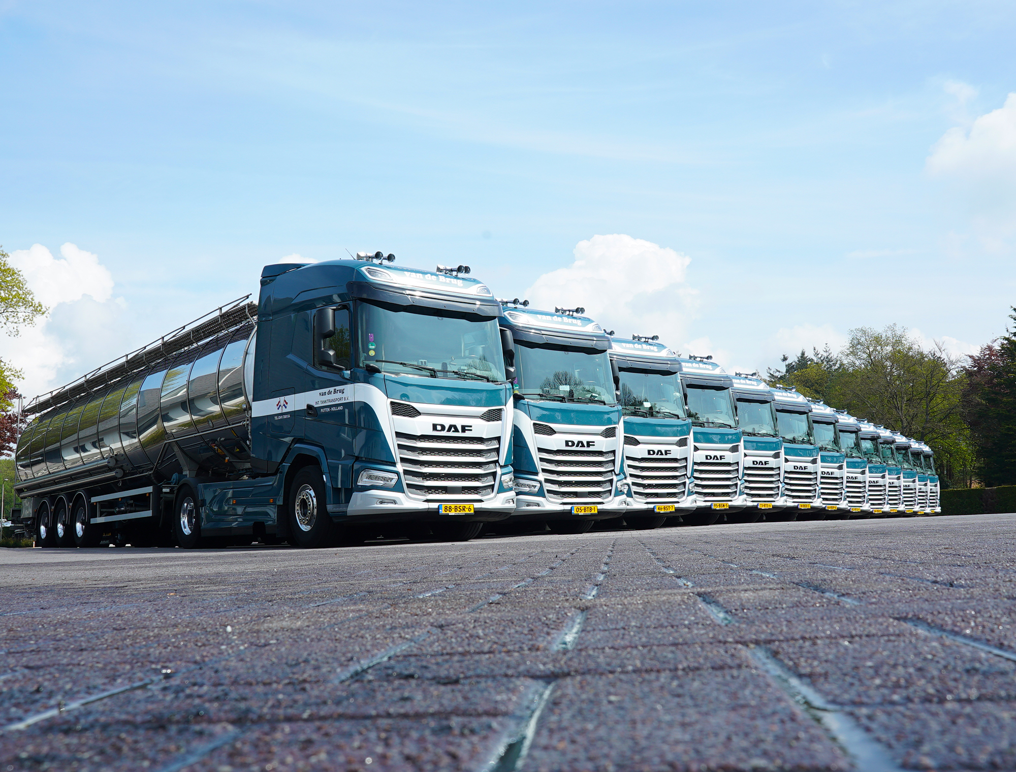 Het gaat hierbij om vijftien DAF XG 480 4×2 trekkers en één DAF XG FAN 3-assige motorwagen. Allemaal zijn de trucks voorzien van de ruime XG cabine en de 480 pk sterke MX13 motor. Als accessoires werden vier luchthoorns en een zonneklep gemonteerd. DAF is geen vreemd merk in het wagenpark van Van de Brug. Men heeft zelfs nog een 3300 die in de jaren 80 bij de firma reed in de schuur staan. Met de komst van de Nieuwe Generatie DAF’s is Van de Brug klaar en goed voorbereid op de toekomst.