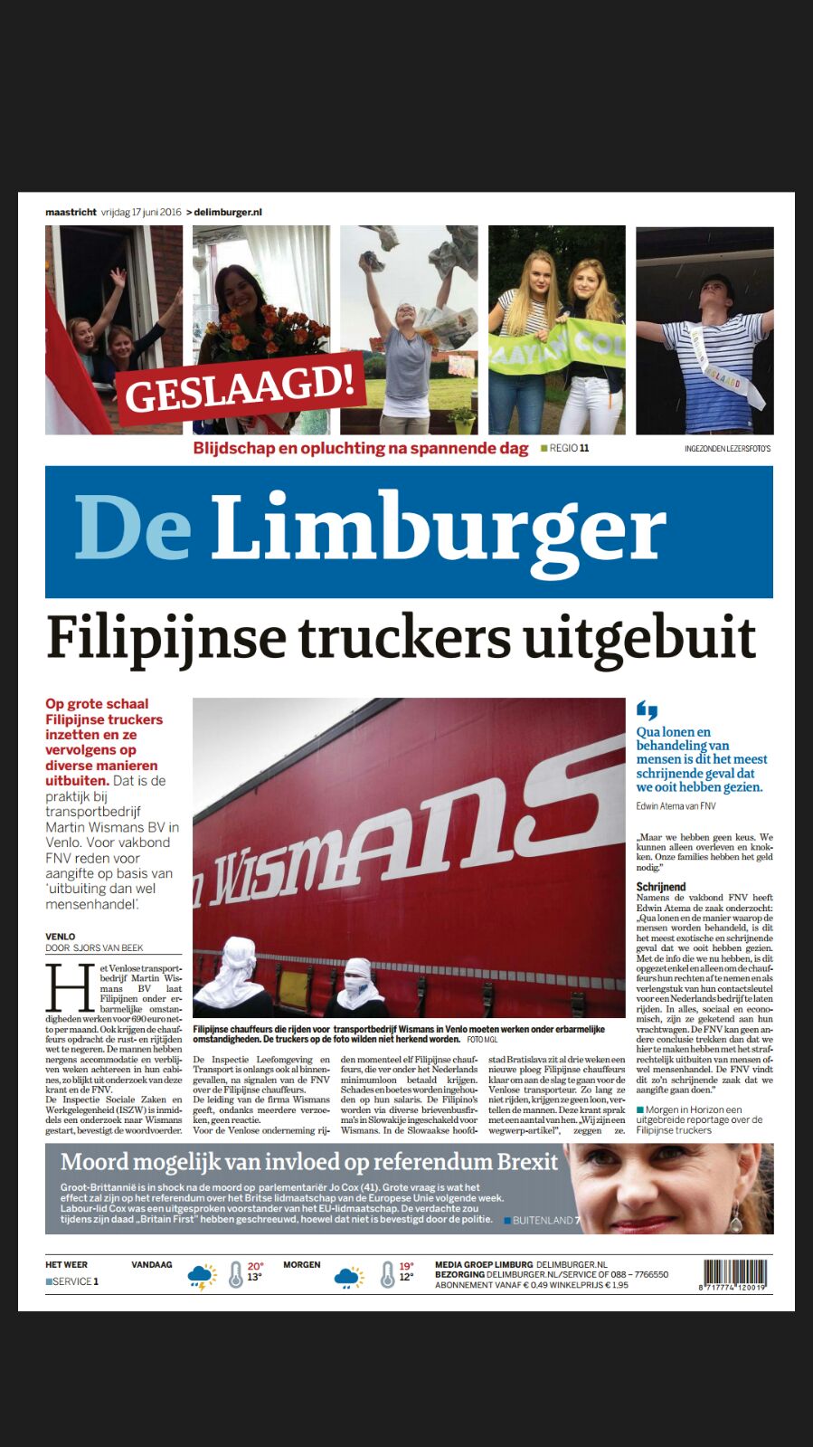 De Inspectie Sociale Zaken en Werkgelegenheid (SZW) is inmiddels een onderzoek gestart naar het transportbedrijf uit Venlo. De verslaggever van De Limburger, Sjors van Beek, schrijft dat hij met enkele Filipijnse chauffeurs heeft gesproken. “Wij zijn een wegwerp-artikel”, zeggen zij, “Maar we hebben geen keus. Onze families hebben het geld nodig. We moeten proberen te overleven.”