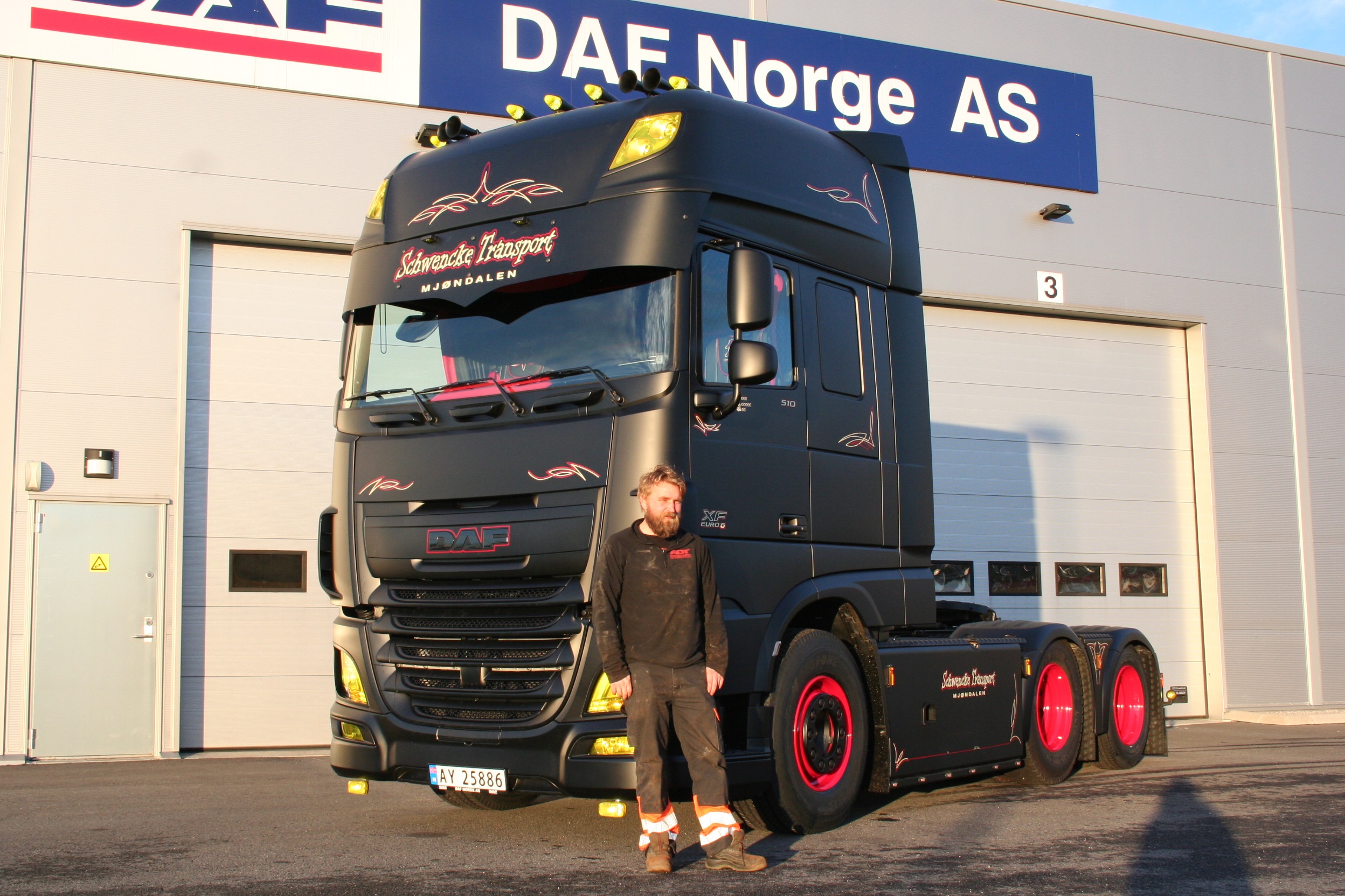 De trekker was ons al opgevallen via de sociale media, maar dankzij Vidar kennen we nu ook exclusief de achtergrond van de mattzwarte XF. Het blijkt een truck met een bijzonder verhaal. Vidar: “Het begon toen ik jaren terug toen ik in een gekke bui mijn idee op papier zette met photoshop. Gewoon, om te kijken hoe het eruit zou zien. Het bleef echter bij een idee: het resultaat heeft jarenlang ingelijst in mijn kantoor gehangen.” Daar kwam verandering in toen Atle Havig het team van DAF Noorwegen kwam versterken.