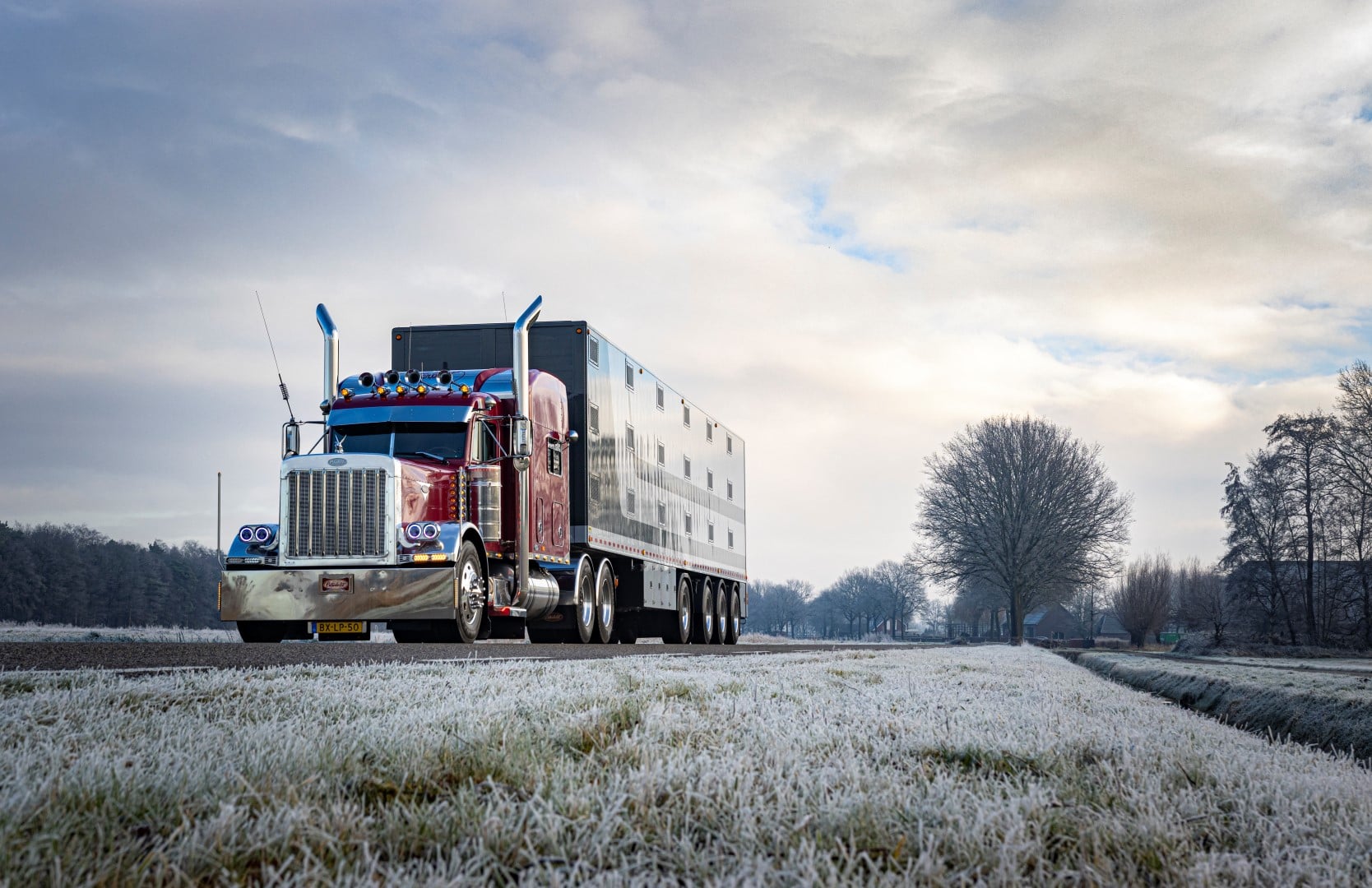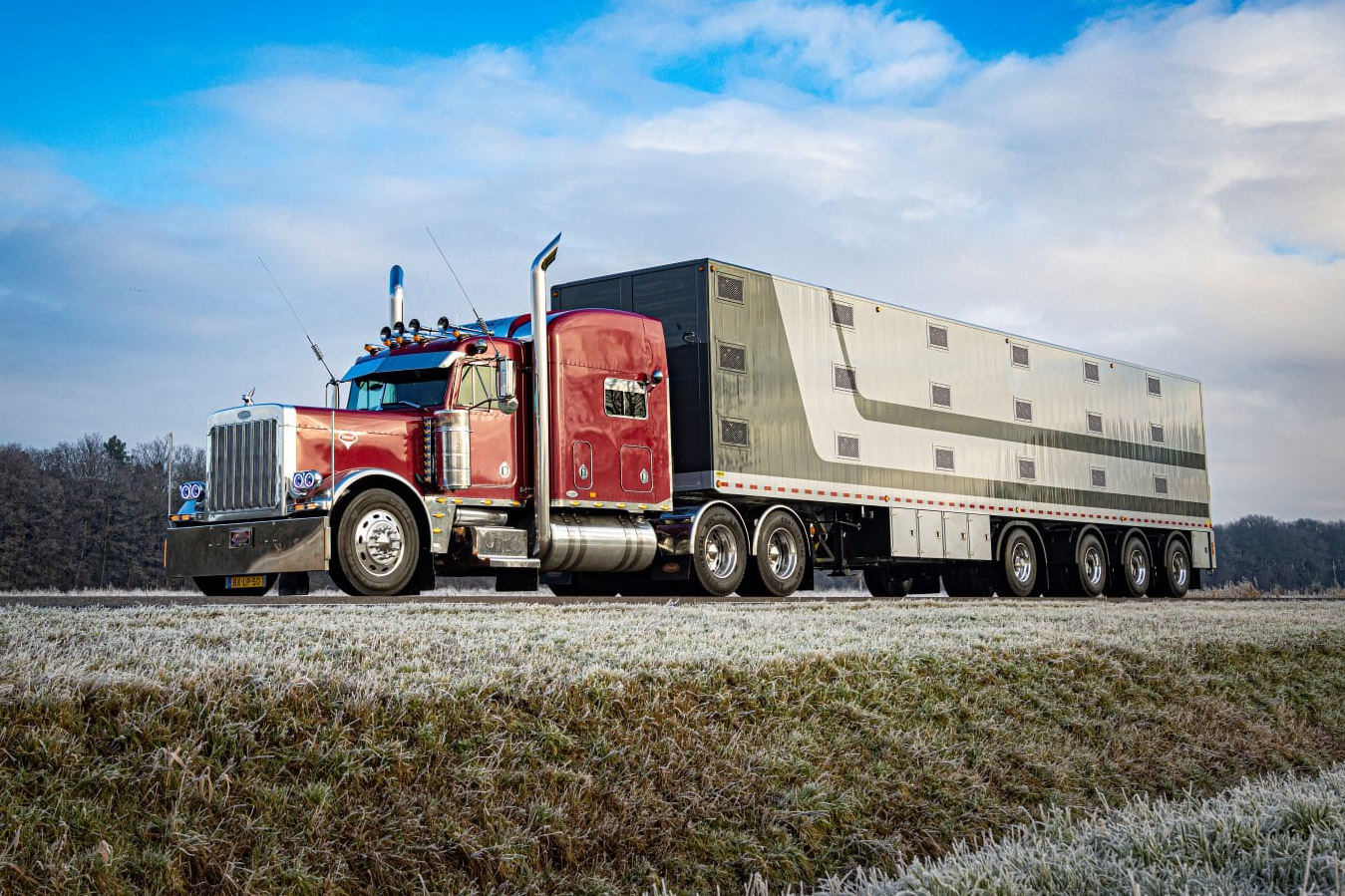 Voor een fotoshoot werd de hulp van Fons van den Berkmortel ingeroepen. Zijn Amerikaan is een bekende verschijning en zorgde voor een bijzonder plaatje op een koude januariochtend. De Peterbilt met daarachter de vierassige veetrailer lijken voor elkaar bestemd. Een machtig mooi Amerikaans tafereel in de Brabantse polder.