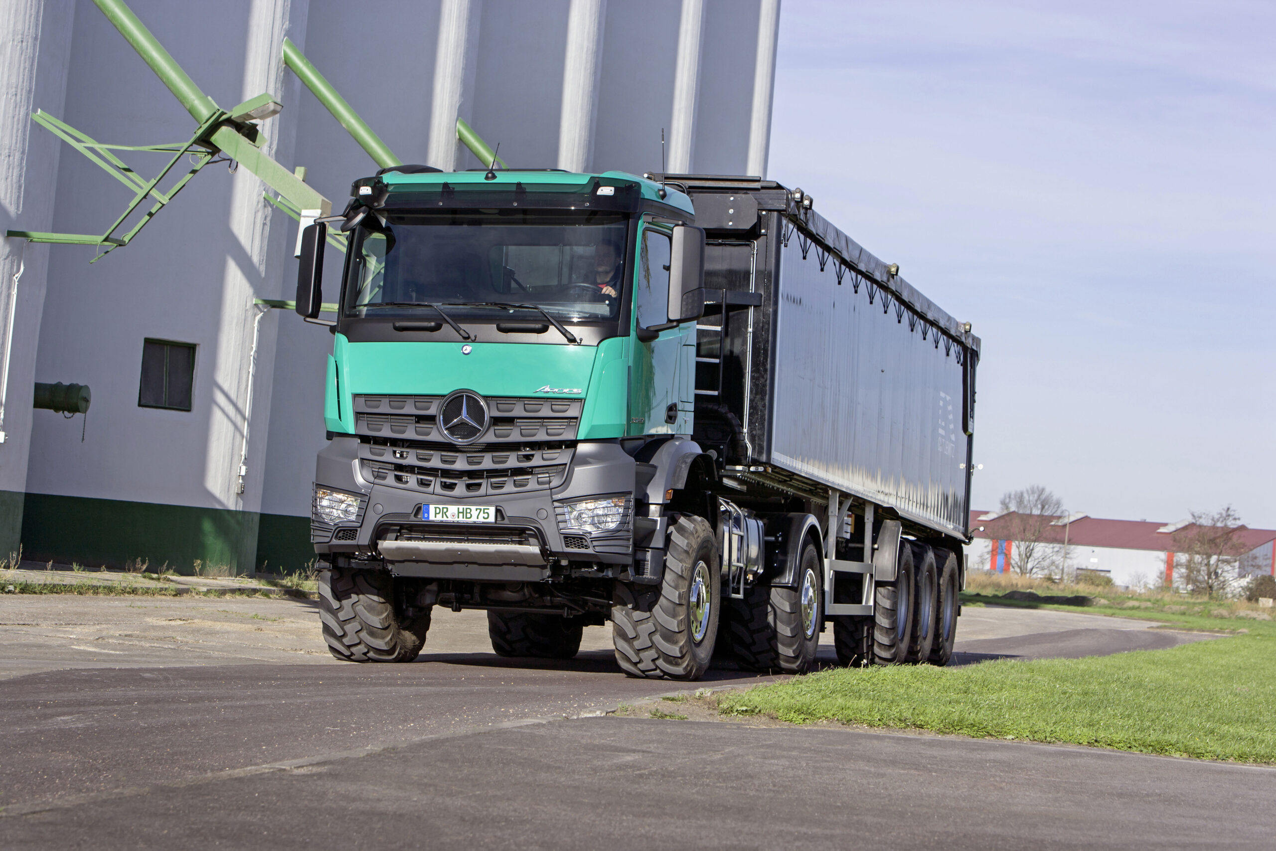 Landbouwproducten moeten van de akker naar de plek waar ze verwerkt worden. Wat is er handiger dan een trekker voor dit traject? Een truck die ook op de akkers kan rijden. En dat is de hoogpotige Arocs AK 4×4 met zijn brede terreinbanden. Handig is verder dat hij normaal gekentekend is en dus 80 km/u mag rijden op de openbare weg en op snelwegen waar een landbouwtrekker niet komen mag.
