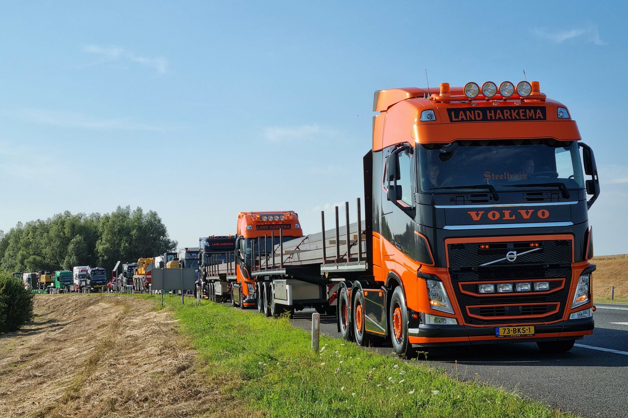 Het is ook dit jaar weer een spectaculaire stoet van zware trekkers, gekoppeld aan trailers zoals diepladers en semi-diepladers. Stuk voor stuk beladen met lange, brede, zware en onhandelbare machines, voertuigen en materialen. Zoals de 2-bed-4 dieplader van Mark Mud, waarop een gigantische puinbreker staat. Ook de 10-assige semi van Combex is van de partij.