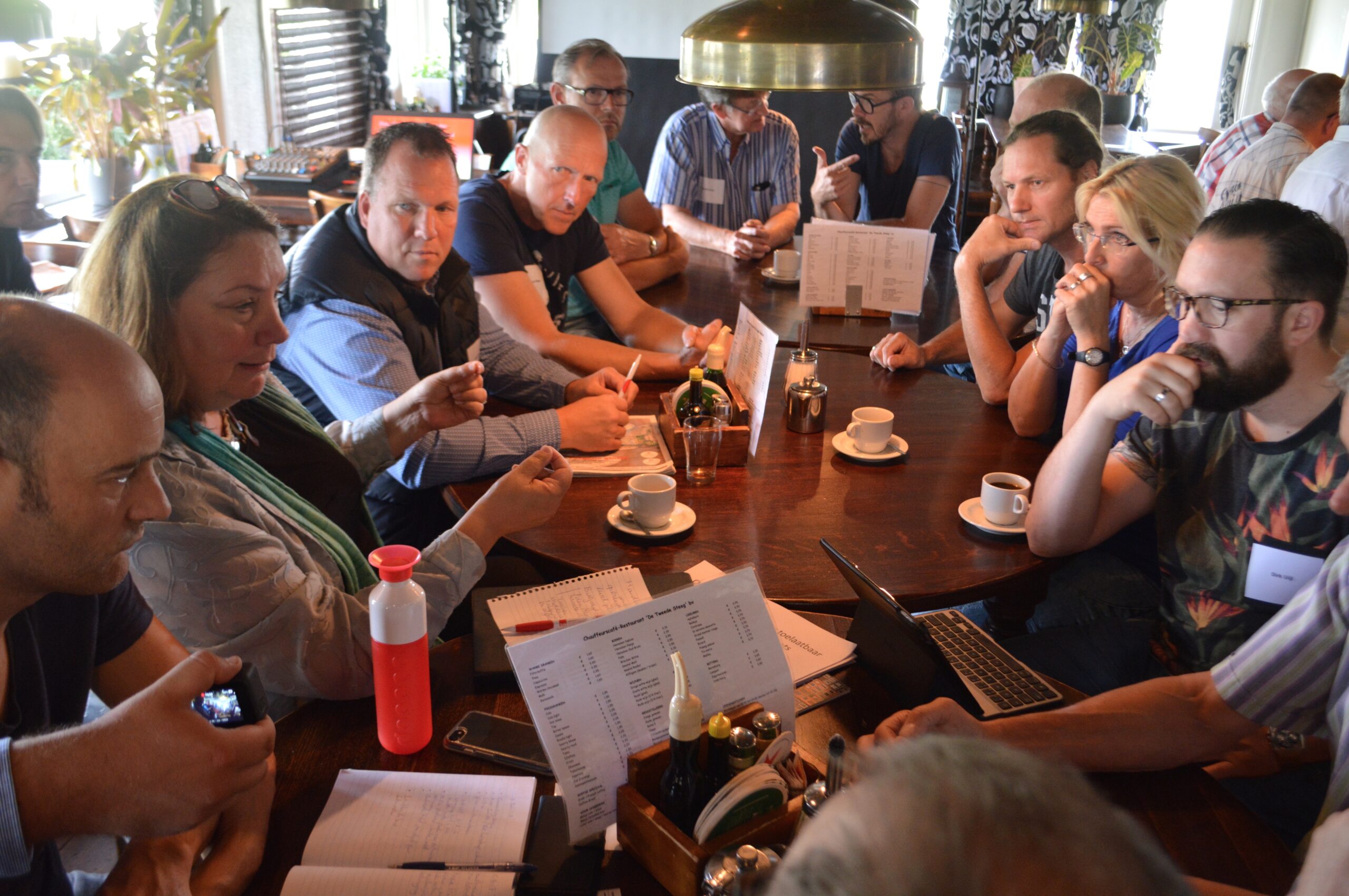 Foto: Agnes Jongerius in gesprek met chauffeurs in chauffeursrestaurant De Tweede Steeg in Amersfoort.