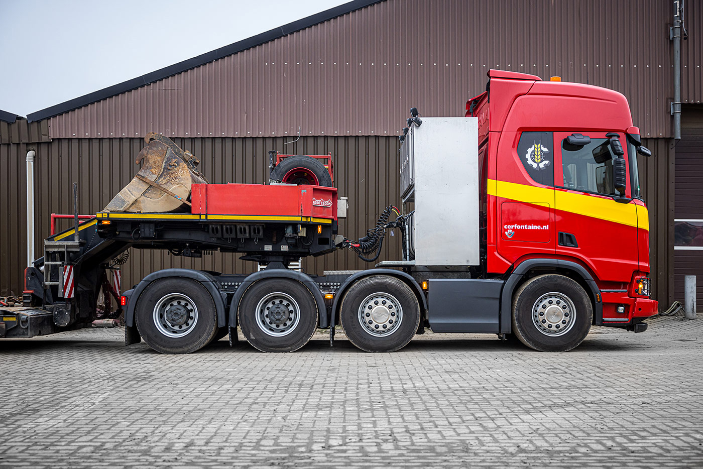 “Zo zwaar gaan wij eigenlijk nooit, bij 100 ton houdt het bij ons wel op,” vertelt directeur en mede-eigenaar Daniël Cerfontaine over de nieuwste Scania in het bedrijf. “Wij zetten de auto in voor een vierassige dieplader in het transport van voornamelijk onze eigen grondverzetafdeling. Maar we rijden ook voor derden.”