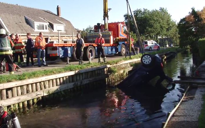 De auto kwam op z’n kop in het water te liggen. Een chauffeur van Verweij’s Trucking, die met zijn een truck in de buurt was, kwam onmiddellijk in actie.