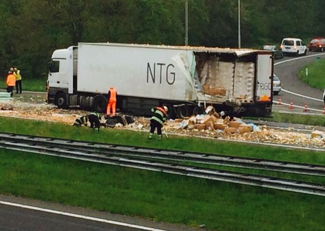 Aan het einde van de ochtendspits, op de A27 bij Eemnes net voorbij een afslag, ramde een Nederlandse truck geladen met uien een koelwagen geladen met diepgevroren afbakbroodjes. De ravage was enorm, er vielen gelukkig – en ongelofelijk – geen gewonden.