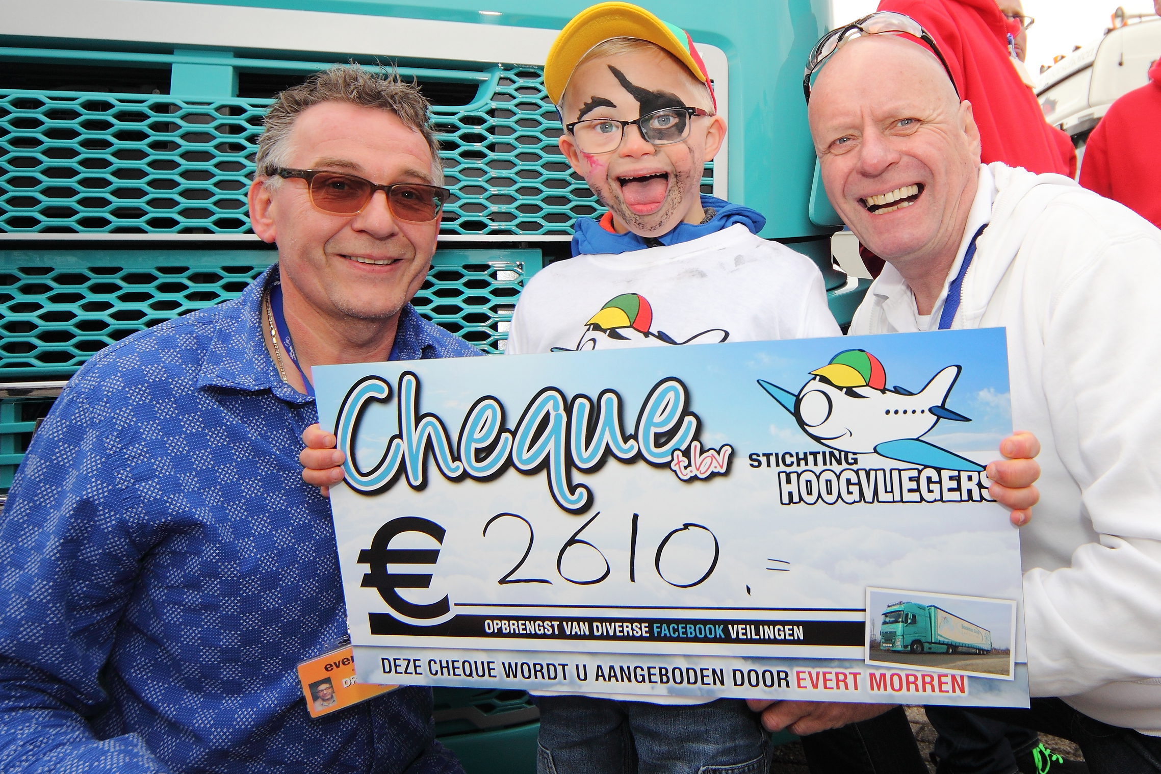 Een flinke donatie voor de Stichting Hoogvliegers tijdens de Hoogvliegersdag op vliegveld Lelystad zaterdag 11 april: chauffeur Evert Morren (links op de foto) overhandigde een cheque ter waarde van 2.610 euro: de opbrengst van een door hem opgezette Facebook-veiling.