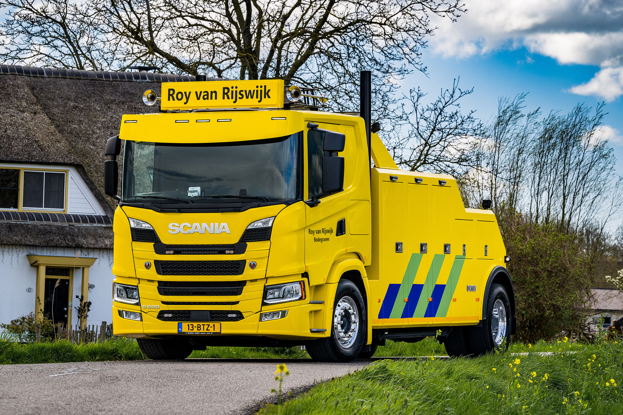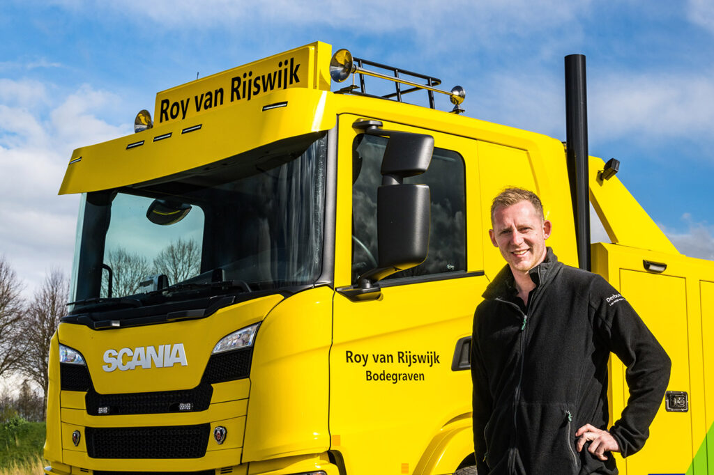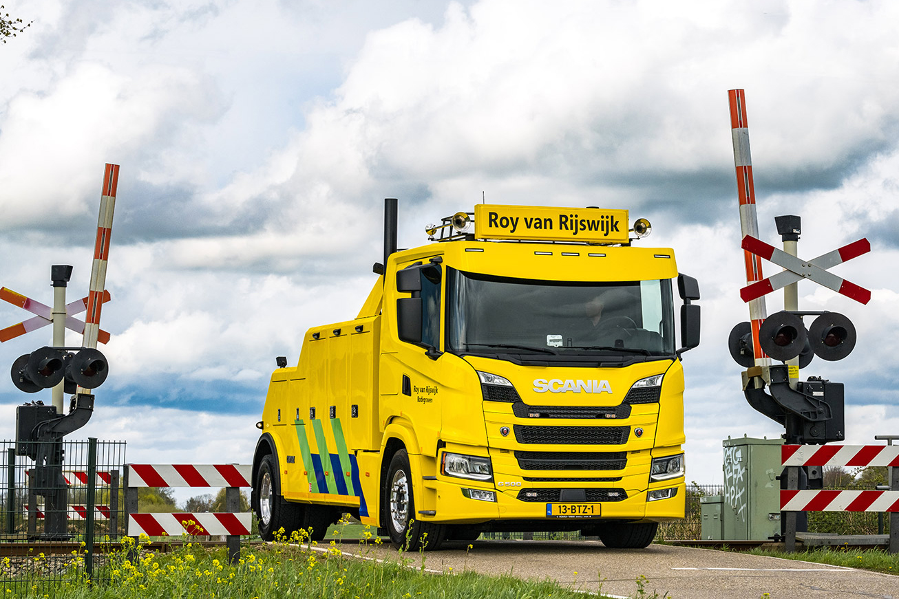 Bergingsbedrijf Roy van Rijswijk uit Bodegraven nam onlangs zijn nieuwe Scania G500 4×2 bergingstruck in gebruik. Het is de eerste Scania die Roy koopt. “We zochten een compacte medium wrecker die zich niet meteen verslikt als het een keertje wat zwaarder is. En hij moest een stoere uitstraling hebben. De G500 Scania vult dat plaatje precies voor ons in,” aldus eigenaar Roy van Rijswijk.