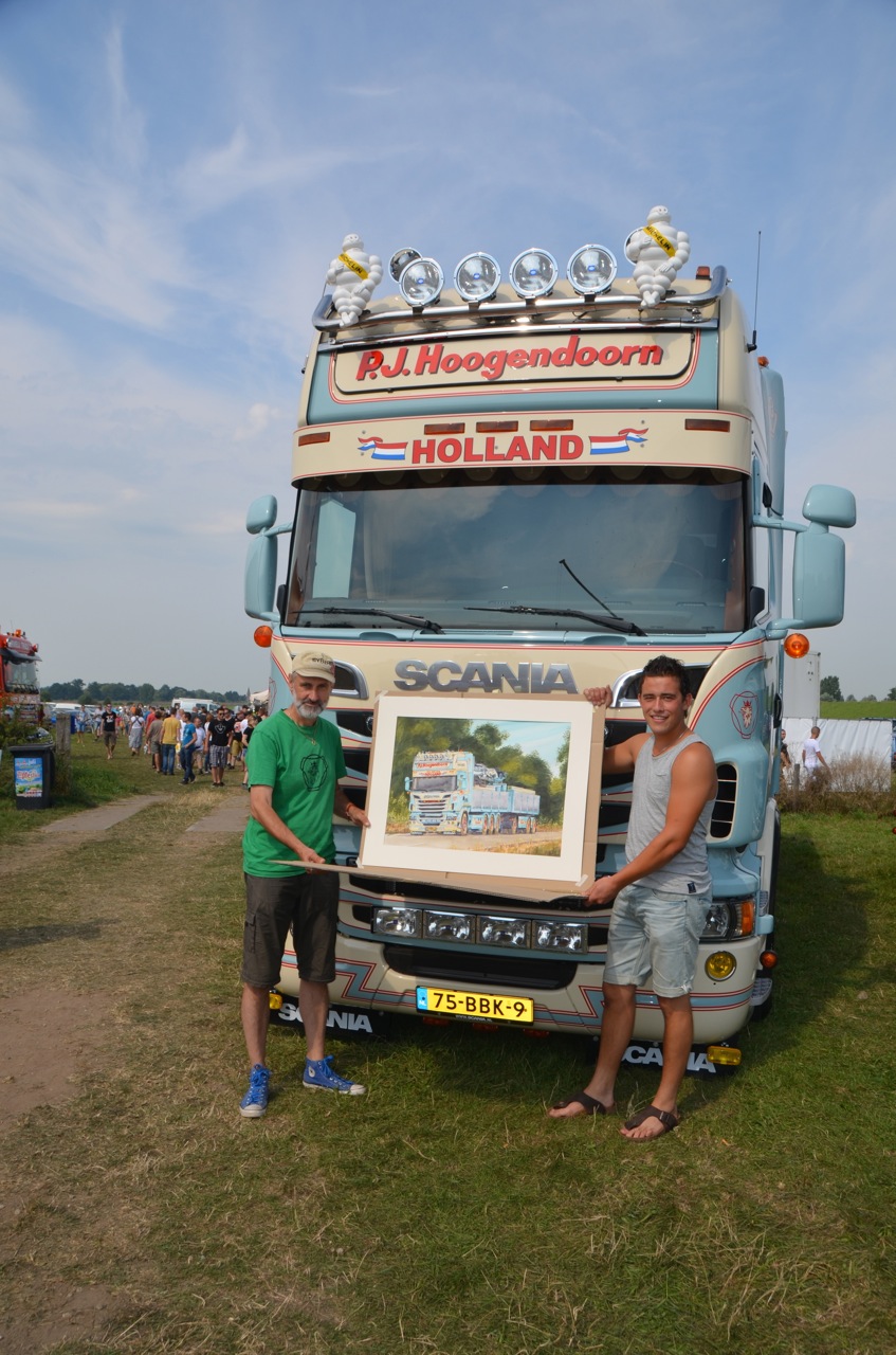Een week na de verkiezing van de Mooiste Truck tijdens het Truckstar Festival, krijgt de winnaar steevast op Nog Harder in Lopik een schilderij van de desbetreffende truck overhandigd van truck-schilder Cor Poldervaart. Een prachtig gebaar, en ook dit jaar weer een schitterend schilderij, waarop de zeven-assige Scania-combi van P.J. Hoogendoorn en chauffeur Evan van Ginkel prijkt.