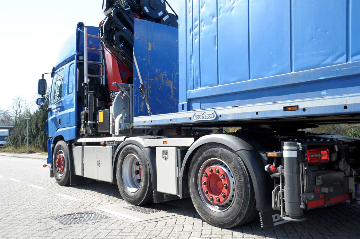 Veldhuizen Wagenbouw verplaatste de luchtgeveerde, gedwongen gestuurde DAF naloopas 41 cm naar achteren waardoor de asafstand tussen as twee en drie nu 181 cm bedraagt. Daarnaast werd de ophanging en de luchtvering van de derde as aangepast voor de 10 ton aslast. Uiteraard werd ook het remsysteem aangepast. Door deze wijzigingen bedragen de aslasten nu 10 ton op de vooras. 11,5 ton op de aangedreven as en nog eens 10 ton voor de naloopas. De HMF 7020 autolaadkraan werd opgebouwd door Vlarotech in Benningbroek