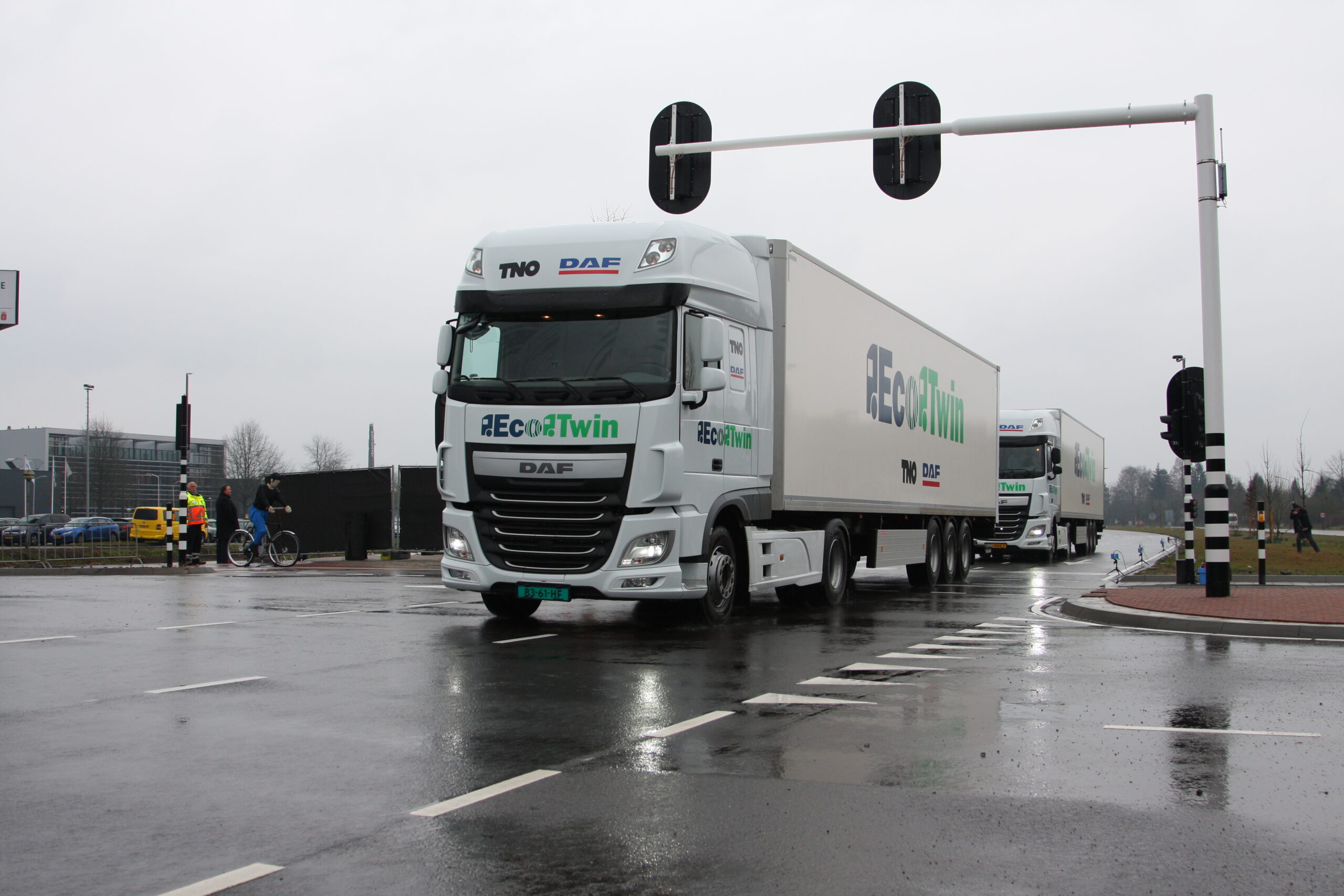 De EcoTwin platooning-demonstratie vond plaats in Helmond. Een autonoom rijdende truck volgde een andere truck op ongeveer een seconde met veertig kilometer per uur. De chauffeur in de autonoom rijdende truck hoefde geen gas te geven, niet te remmen en niet te sturen.