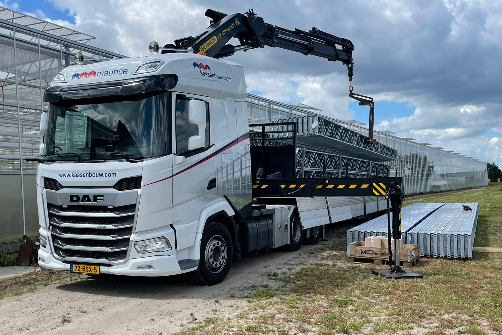 Maurice Kassenbouw heeft twee DAF-trekkers waarvan deze nieuwe de grootste is. Daarnaast beschikt het bedrijf over een 7-tal opleggers/diepladers. Van Haaster: “DAF heeft onze voorkeur omdat het een Nederlands product is. Dat vinden wij belangrijk omdat we zelf een Nederlands productiebedrijf zijn van glastuinbouwprojecten voor groente-, bloemen- en fruitteelt. 20% van de projecten worden gebouwd en geleverd in Nederland. 80% van de bouwprojecten en leveringen is over de grens in onder meer Europa, Noord-Amerika en Azië. De producten en projecten gaan dus de hele wereld over.”