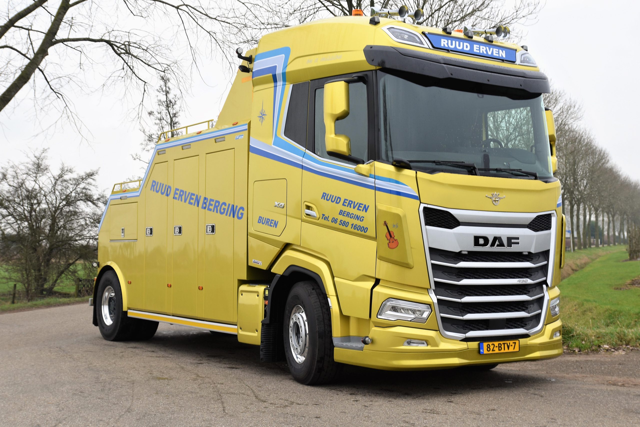 DAF-dealer Van Tilburg-Bastianen in Tiel heeft onlangs de sleutels van de DAF XG 430 officieel overhandigd aan Ruud Erven Berging. De DAF XG is voorzien van een verzwaarde achteras en luchtgeveerde vooras. De bergingsinstallatie is een DGT 16.000 met 16 tons lier en de opbouw van de kasten is verzorgd door HSM in Utrecht.