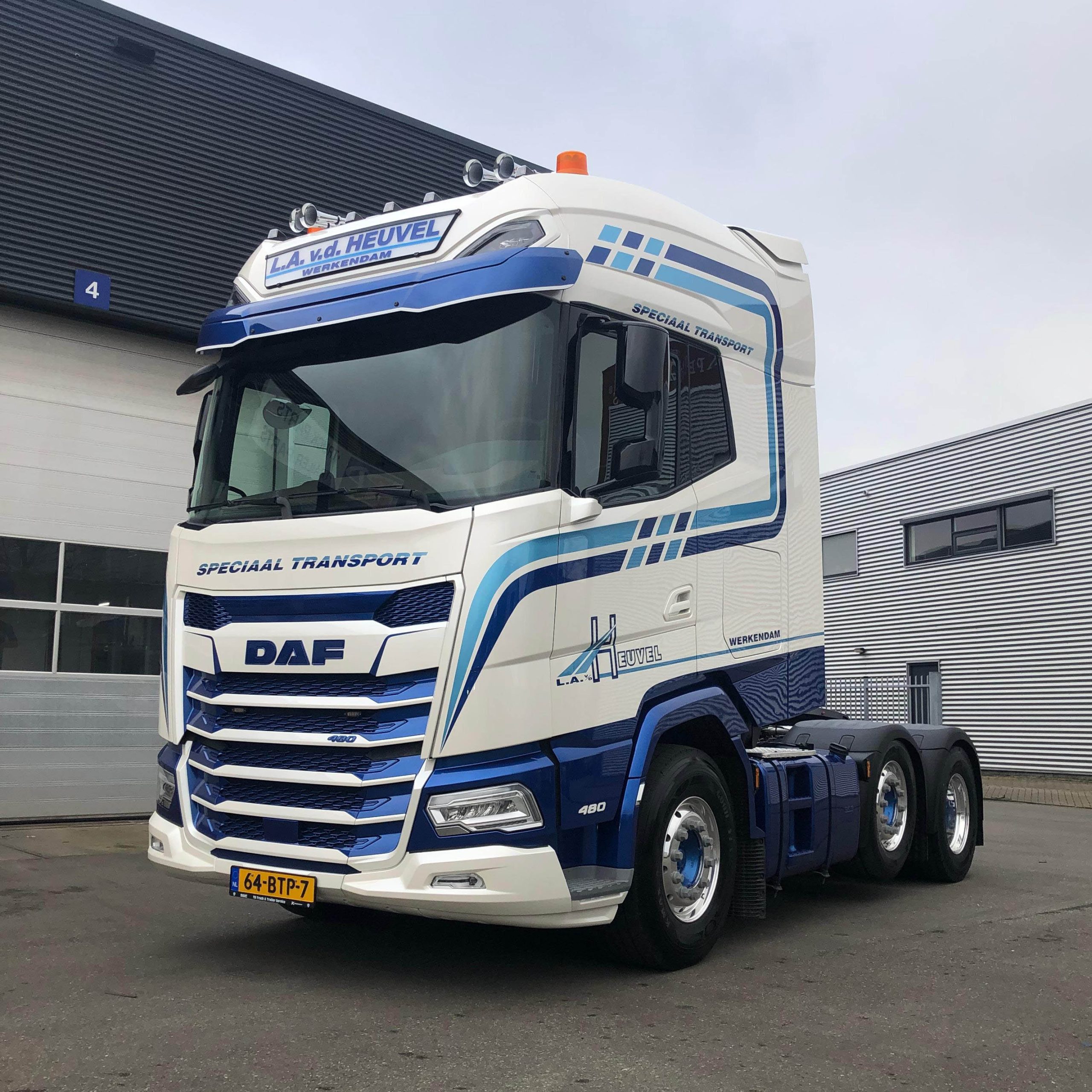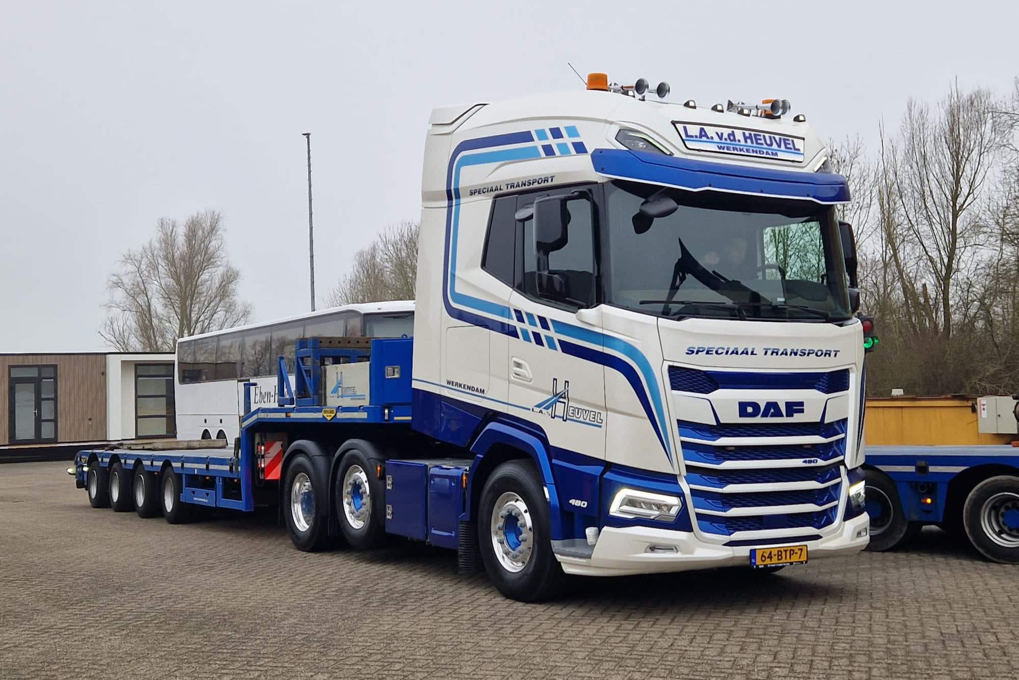 L.A. v/d Heuvel rijdt al sinds de oprichting in 1993 met DAF. Op dit moment staan er negen trekkers van dit merk voor speciale meerassige trailers en diepladers. Van den Heuvel: “80 procent van ons transport voor weg- en waterbouw is in Nederland, 20 procent gaat naar het buitenland. Daarvoor hebben we de nieuwe DAF XG+ ingezet. Voor de lange afstand gebruiken we het liefst jonge en betrouwbare trucks. Stilstand in het buitenland is een drama. Dat moet je echt niet hebben met een grote en zware vracht, waarvoor je niet zomaar een andere geschikte en gecertificeerde trekker beschikbaar hebt.”