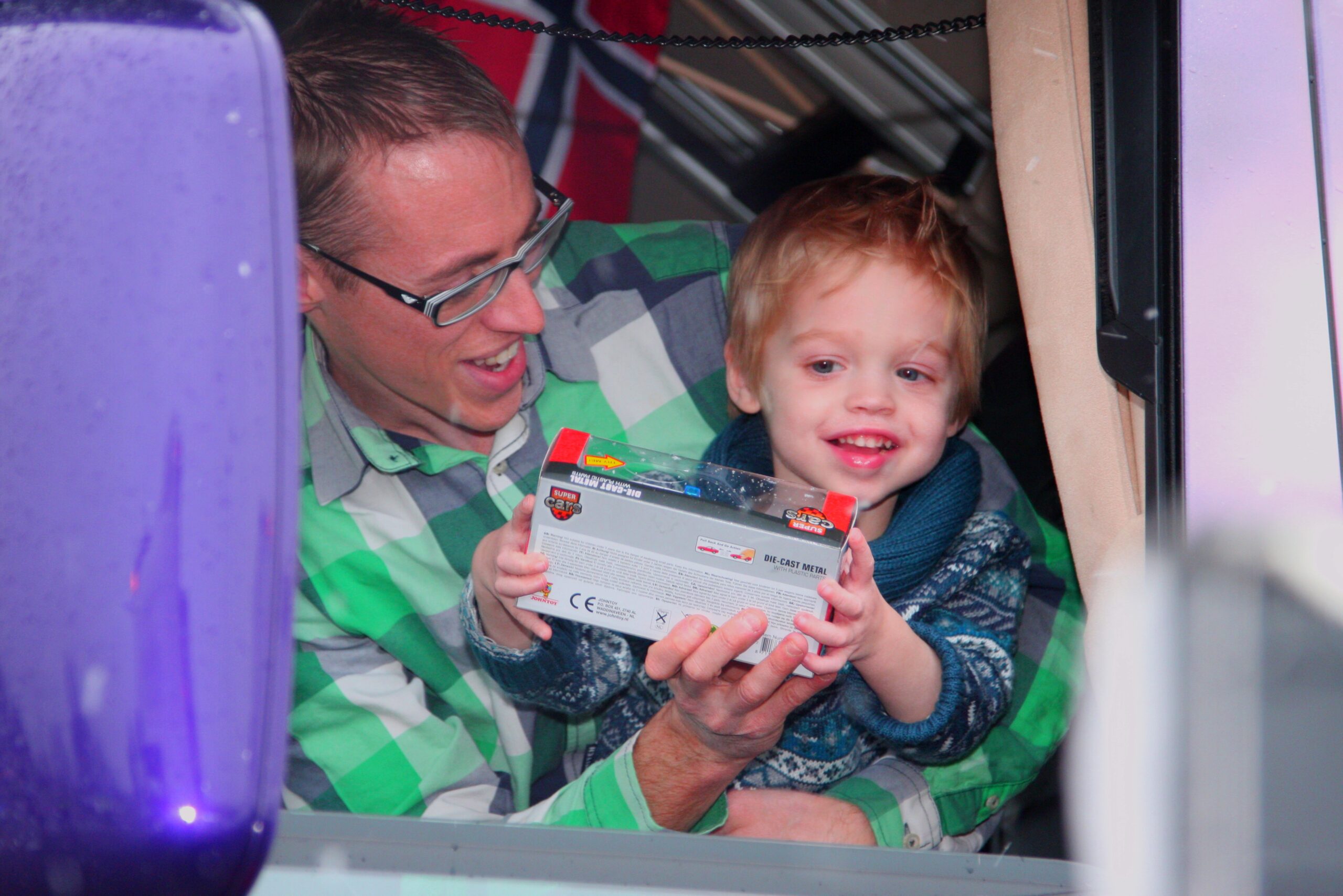 Foto: Noah is blij verrast met een cadeautje terwijl hij op schoot zit bij zijn vader in de truck van Hoogvliegers-voorman Frank Bakker tijdens de Run4Noah.