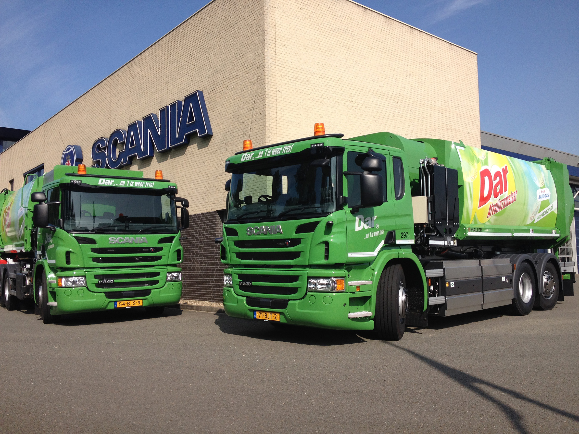 Dar, het gemeentelijke samenwerkingsverband voor duurzaam afvalbeheer in de regio Nijmegen, zet sinds kort twee CNG-gestookte Scania P280 6×2 vuilniswagens in.