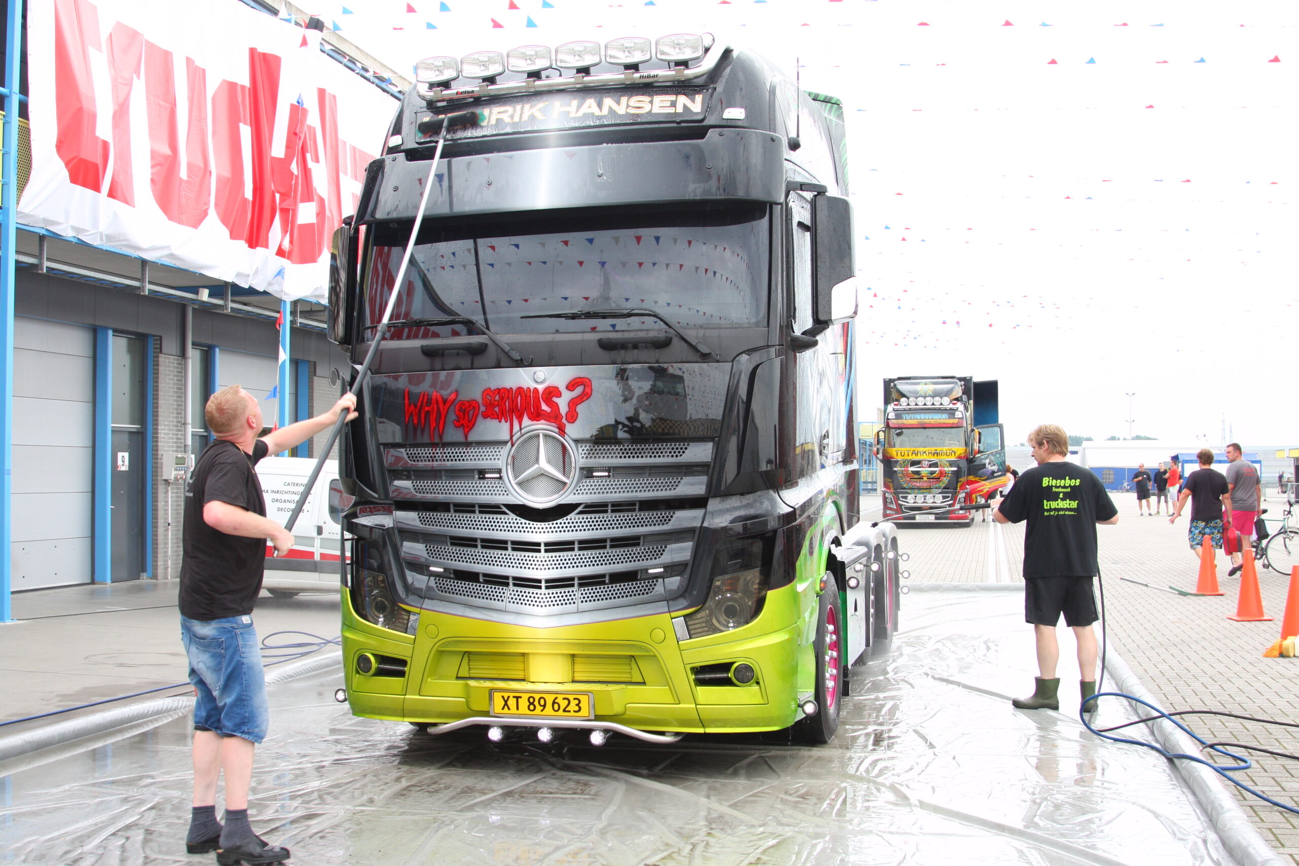 Na een rit uit Denemarken krijgt deze sublieme Joker-Actros een verfrissend bad.