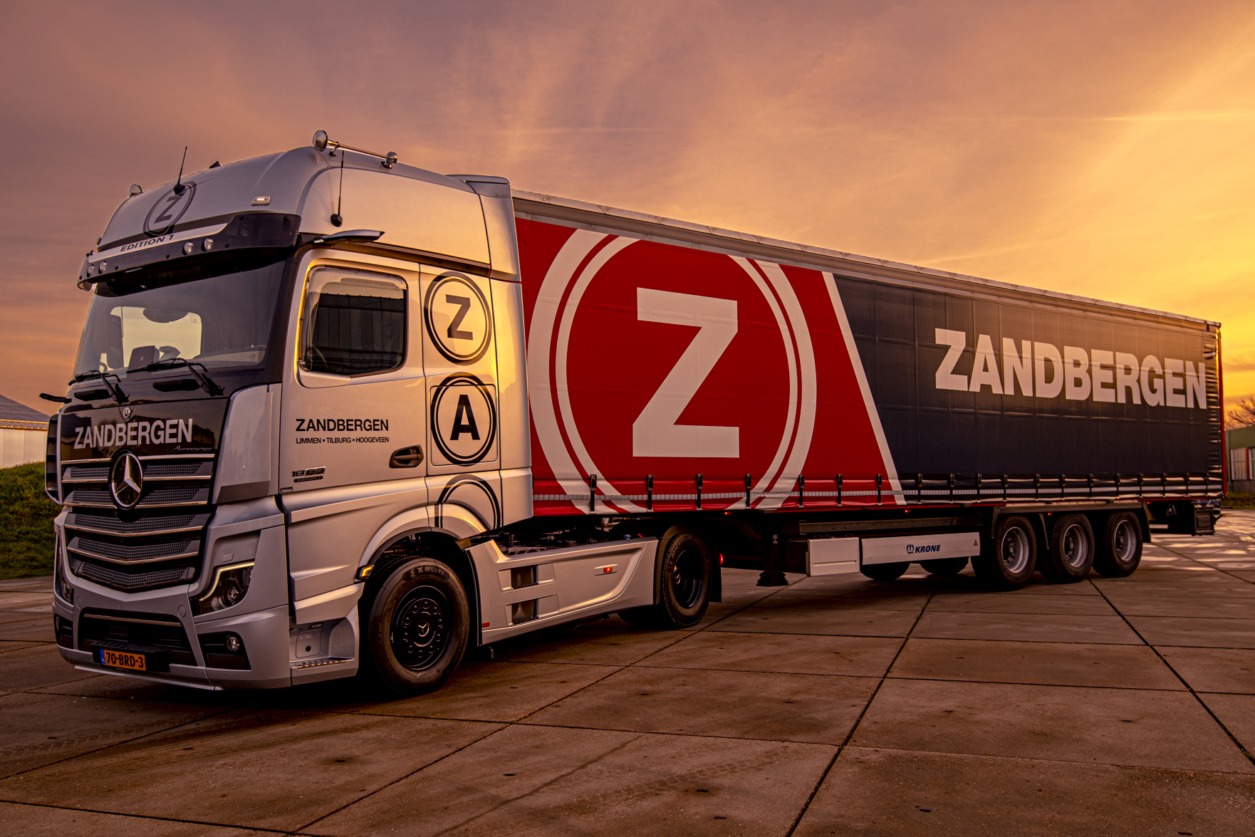 Deze Actros Edition 1 is een limited edition met GigaSpace cabine, de grootste cabine die Mercedes-Benz levert. De unieke truck is voorzien van het ‘Edition 1’-logo op de zonneklep met vier extra led-koplampen, lederen stuurwiel, nappalederen dashboard, exclusieve lak en daarnaast ook nog de verlichte ster van Mercedes‑Benz. De Actros Edition 1 neemt qua uitstraling meteen al een enorme voorsprong. Met talloze bijzondere details, zoals de roestvrijstalen instap of de roestvrijstalen accenten op de zij-skirts is al snel te zien dat het hier geen standaard-truck betreft. Naast het feit dat deze truck een bijzondere verschijning is, is hij ook voorzien van geavanceerde veiligheidssystemen. De SideGuard Assist ondersteunt de chauffeur bij het monitoren van de dodehoek tijdens het afslaan en het wisselen van rijstrook. Active Drive Assist ontlast de chauffeur door automatisch een veilige afstand tot de voorganger te bewaren. Maar ook in het midden van de rijstrook te blijven. Van de Edition 1 zijn in totaal maar 400 exemplaren gemaakt, die inmiddels ook allemaal verkocht zijn. Zandbergen Transport heeft hiermee dus met recht een bijzondere truck binnen gehaald.