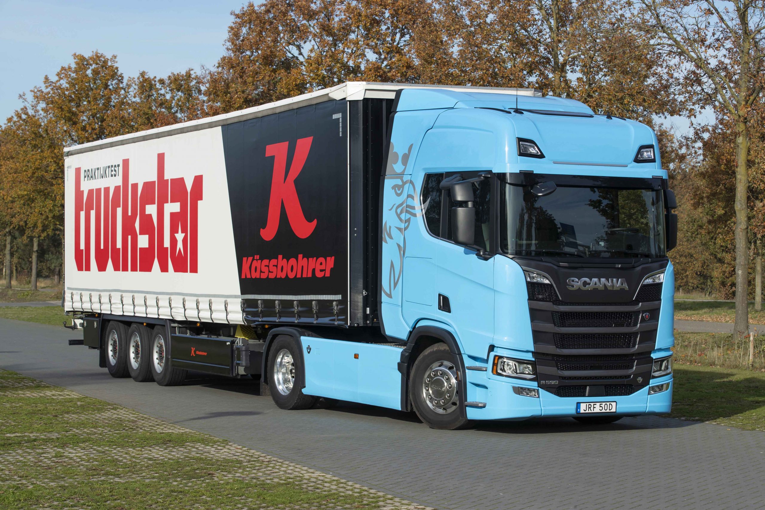 De bewuste testauto met zijn felblauwe kleur is een oude bekende. We mochten Castor – Scania geeft al zijn testtrucks een naam – vorig voorjaar al eens kort proberen in de Ardennen, vooral om kennis te maken met de toen nieuwe V8. Om de iconische motor weer helemaal bij de tijd te krijgen, hebben de Zweden deze uitgebreid onder handen genomen. Dankzij die fijnslijperij aan de bekende zestienliter-V8 – er werden meer dan zeventig nieuwe onderdelen ontwikkeld – is er minder interne wrijving.