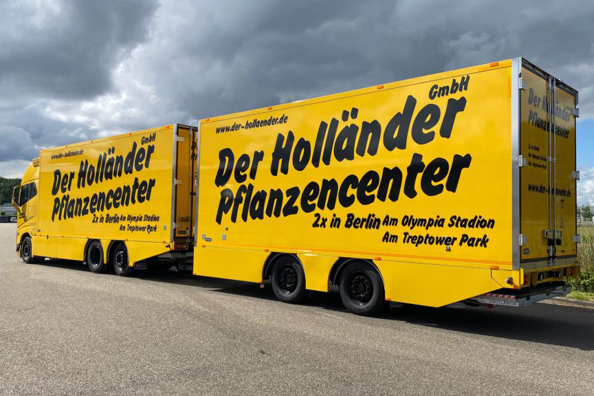 Het geheel is voorzien van een roestvrijstalen gesloten zijafscherming, zijverlichting onder en boven op de profielen. De truck is voorzien van volledige LED verlichting, SKF vetsmering, vloer/dak rails etc. De combinatie is in een opvallende gele kleur gespoten waarna de belettering is aangebracht met de 2 adressen in Berlijn. De combinatie gaat rijden tussen Nederlandse veilingen en de locaties van Der Holländer in Duitsland.