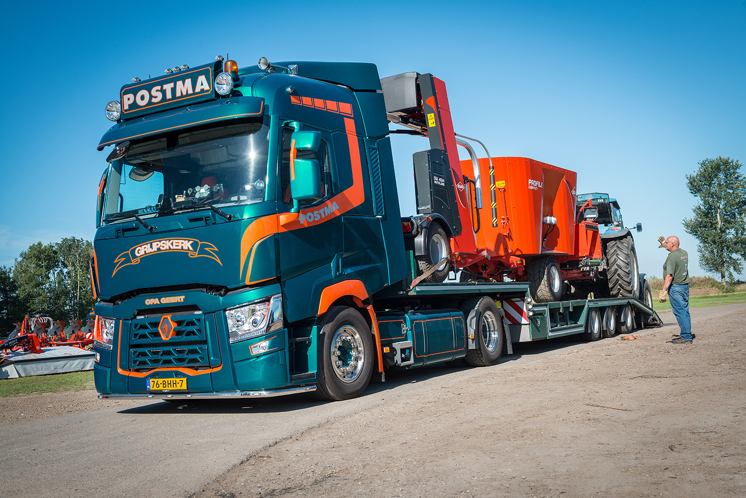 Postma Grijpskerk heeft haar wagenpark uitgebreid met een Renault T. De Renault T van Postma beschikt over 430 pk. De truck wordt ingezet voor het transport van landbouwmachines en uitzonderlijk vervoer in binnen- en buitenland.