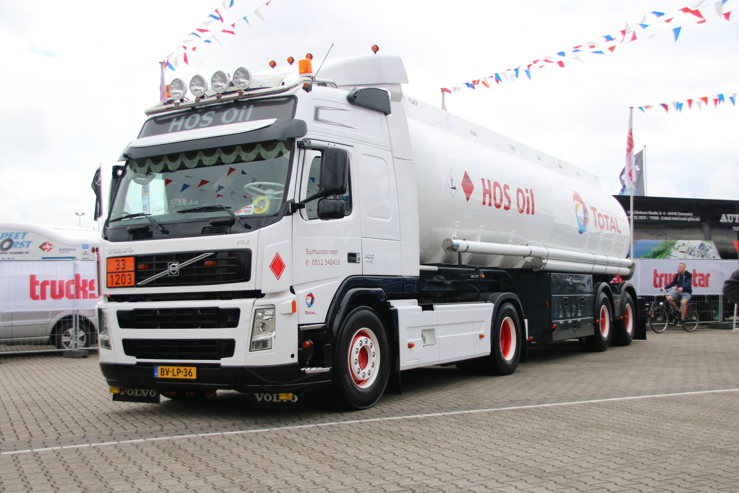 Johan Hoekstra en zijn maat Mark zitten echter rustig naast de truck van Johan, een Volvo FM 400 uit 2008. De dappere FM van HOS Oil strijdt in de categorie Bulk & Tanktransport tegen flink forsere deelnemers; de Kees in ’t Veen Tanktransport Mercedes Actros van Dennis Troost en de Meinders International BV Scania R620 van Remon Kies. “Deze combinatie is nu bijna 9 jaar oud en we hebben hem stapsgewijs zo opgebouwd. We zitten vast aan de reclame voorschriften van Total – zo is zelfs de RAL kleur van het chassis bepaald – maar met subtiele zaken als de kleur van de velgen of een special paint op de achterzijde van de cabine, hebben we de FM een eigen gezicht gegeven”.