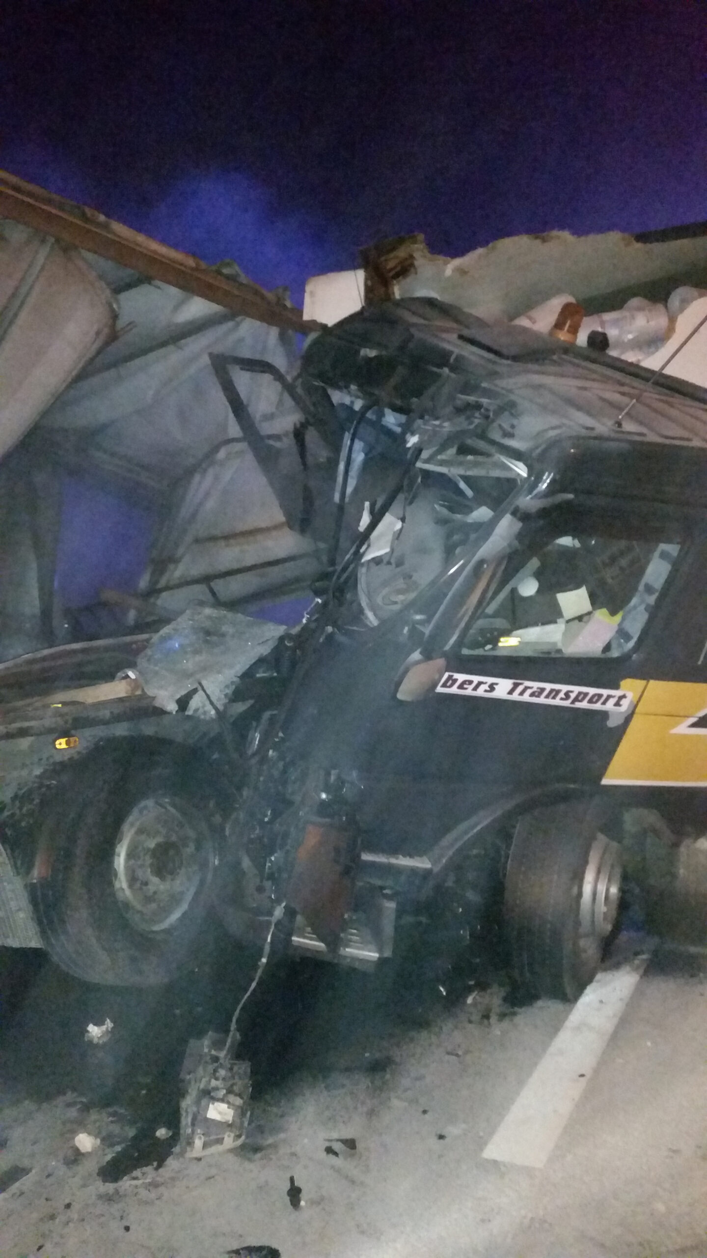 De ravage was gigantisch. Van Richards Volvo FM voorloopastrekker was weinig meer over. Toch wist hij vrijwel ongedeerd via de voorruit uit de truck te klimmen.