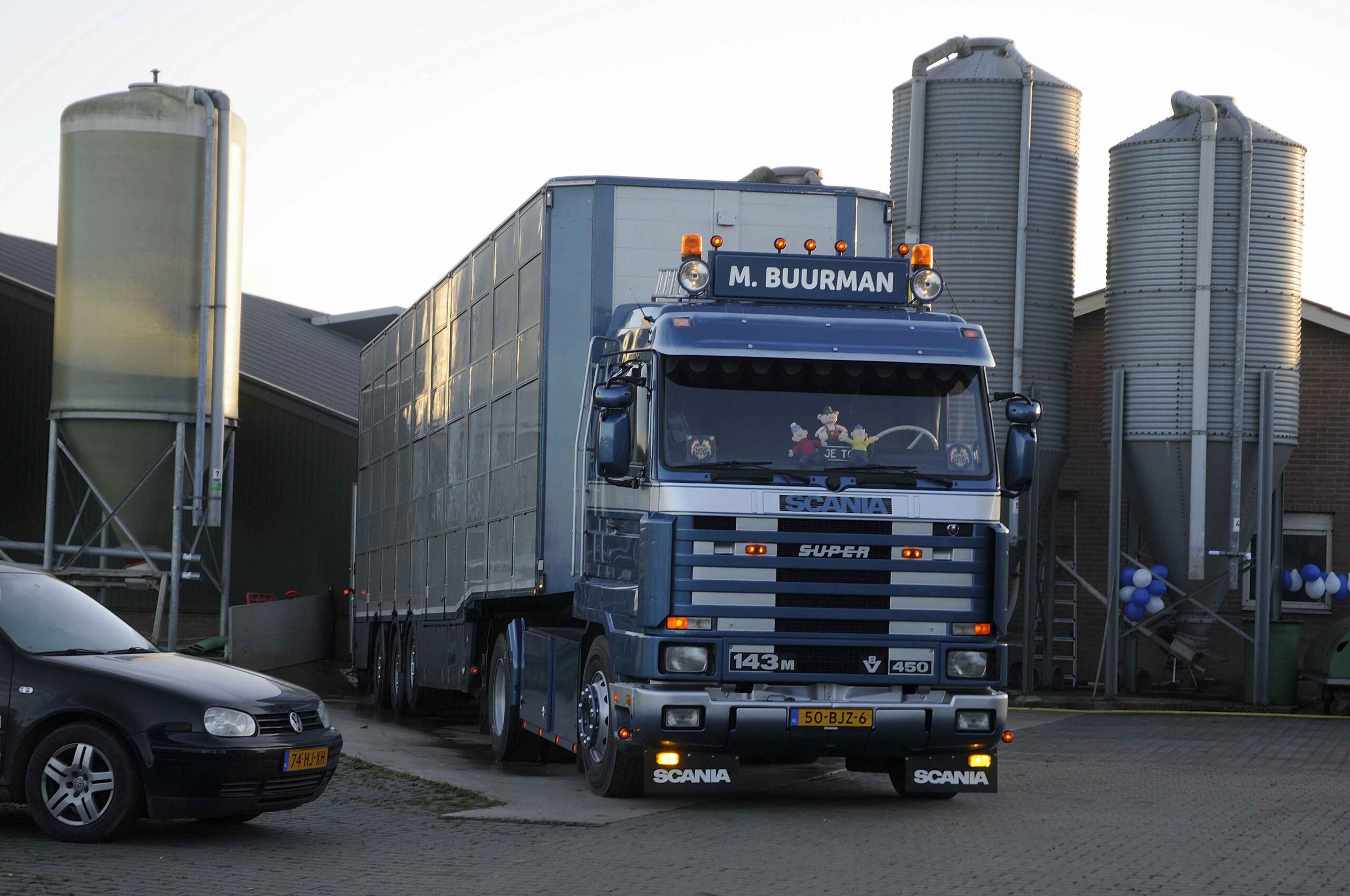 In de categorie bijzondere voertuigen ontwaren wij een met een smartphone gemaakte foto van een fraaie en nog altijd actieve Scania 143 450 van bouwjaar 1995. De Scania voldoet aan alle eisen van de old skool, zoals het kratje bier in het zeilenrek boven op het cabinedak. De chauffeur blijkt Mike Buurman te heten. We verwachten een door de jaren heen gelouterde forse stuurman, maar maken geheel coronaproof kennis met een negentienjarige jongeling. Deze Mike was in 2019 zelfs geruime tijd de jongste chauffeur van onze polder. Ik ontmoet Mike Buurman en zijn fraaie Scania 143 450 op de werf van het familiebedrijf, dat is gevestigd in het Gelderse dorp Angeren. Mike is actief in het veevervoer. Aan de schotel van de Scania bungelt een keurige Berdex-oplegger met drie verdiepingen van bouwjaar 2012. De drieassige Berdex heeft een lift- en stuuras en is speciaal ingericht voor het transport van varkens en biggen.