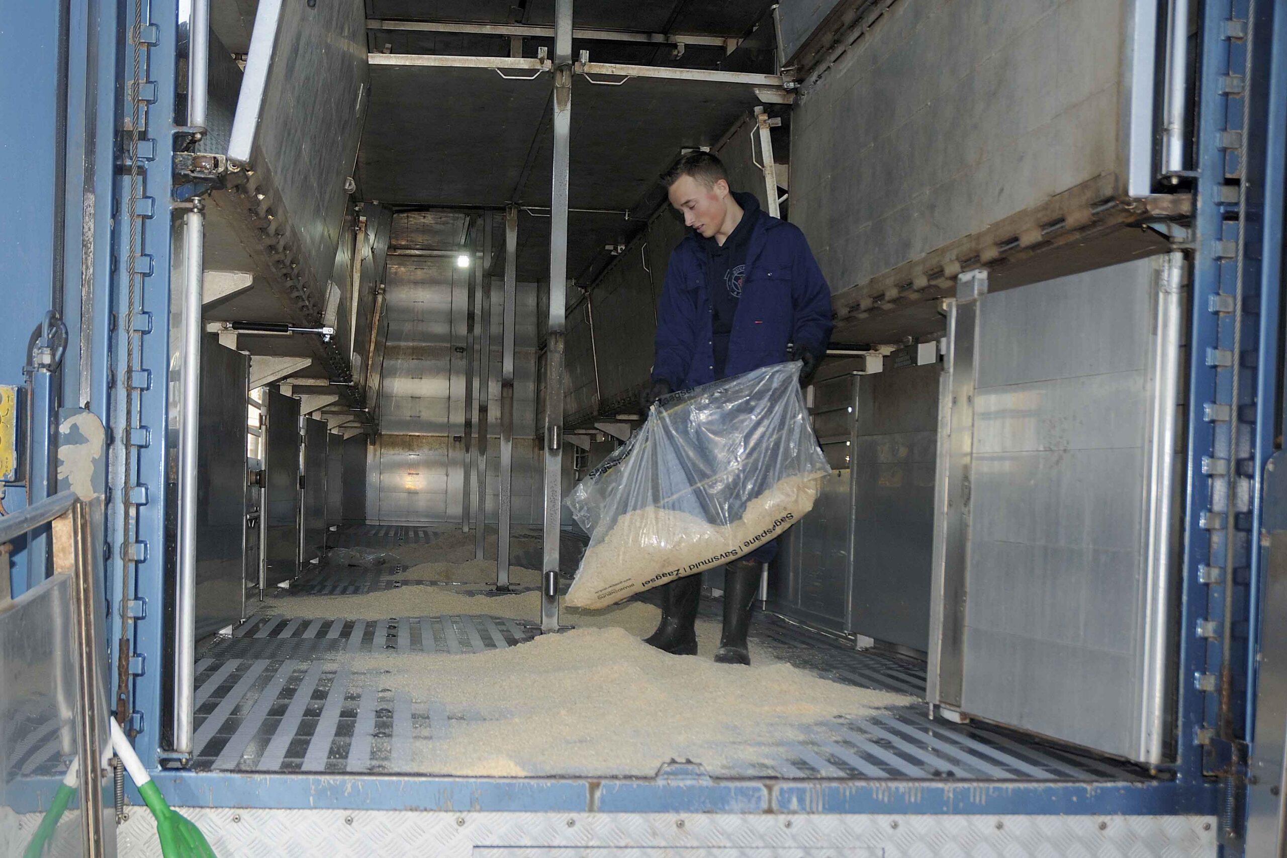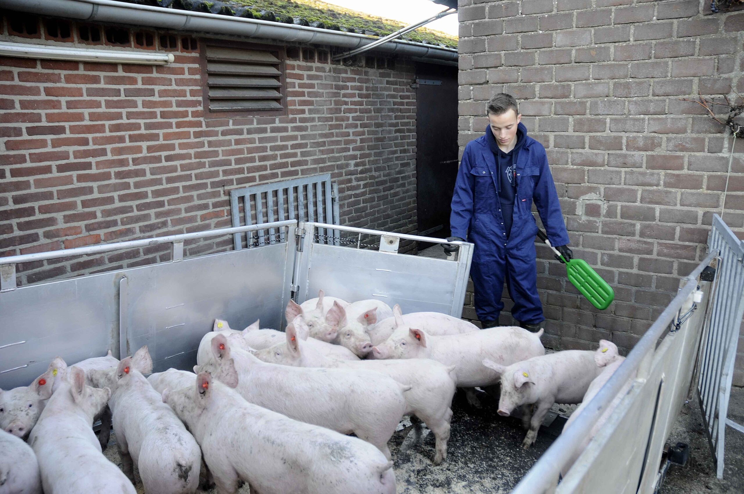 We gaan biggen laden bij een veehouder. Mike strooit eerst een soort grit op de bodem van de oplegger. Dat spul absorbeert de uitwerpselen en urine van de jeugdige krulstaarten. De knorrende menigte wordt met enige vocale aanmoedigingen en een soort rammelaar naar de oplegger gedreven.