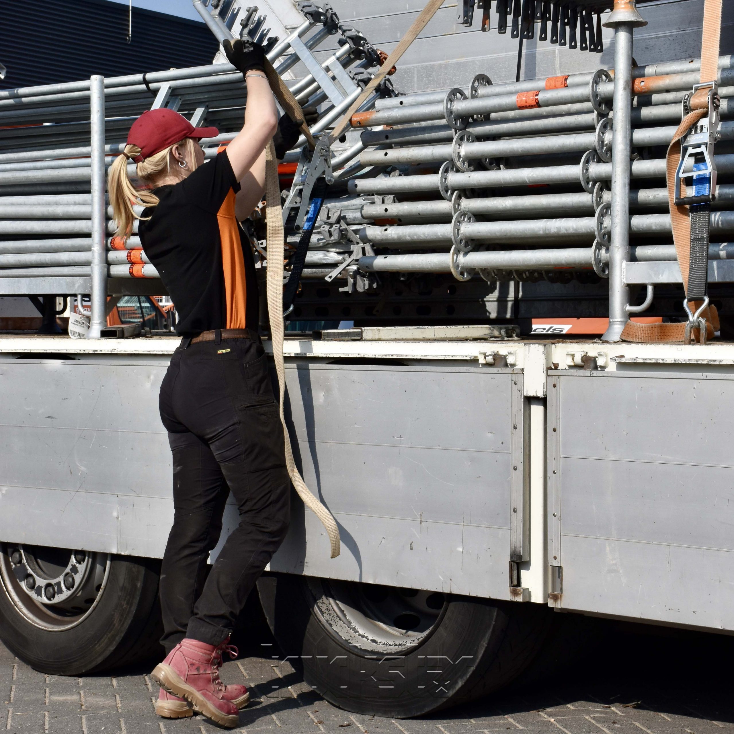 Het was eigenlijk helemaal niet Fabiennes bedoeling om chauffeur te worden. “Ik heb er zelfs nooit aan gedacht,” zegt ze. “Maar toen ik mijn opleiding Sport en Beweging had afgerond, kwam ik een keer toevallig bij WoW om iets te halen of te brengen. Toen liep ik de directeur tegen het lijf, die mij vroeg of ik niet chauffeur wilde worden. Ik zei direct ‘nee’, maar toen ik er later over nadacht, vond ik het wel wat. Ik houd van stoere auto’s en grote trucks. Dus toen heb ik de opleiding gevolgd en sinds een jaar ben ik chauffeur op deze ruim achttien meter lange combinatie met schamelaanhanger en 37,7 ton-meter kraan. Ik vind het echt, echt, echt, echt superleuk. Het rijden met de truck, maar ook het laden en lossen, het klauteren en klimmen over de lading en de contacten met klanten en collega’s: super.”