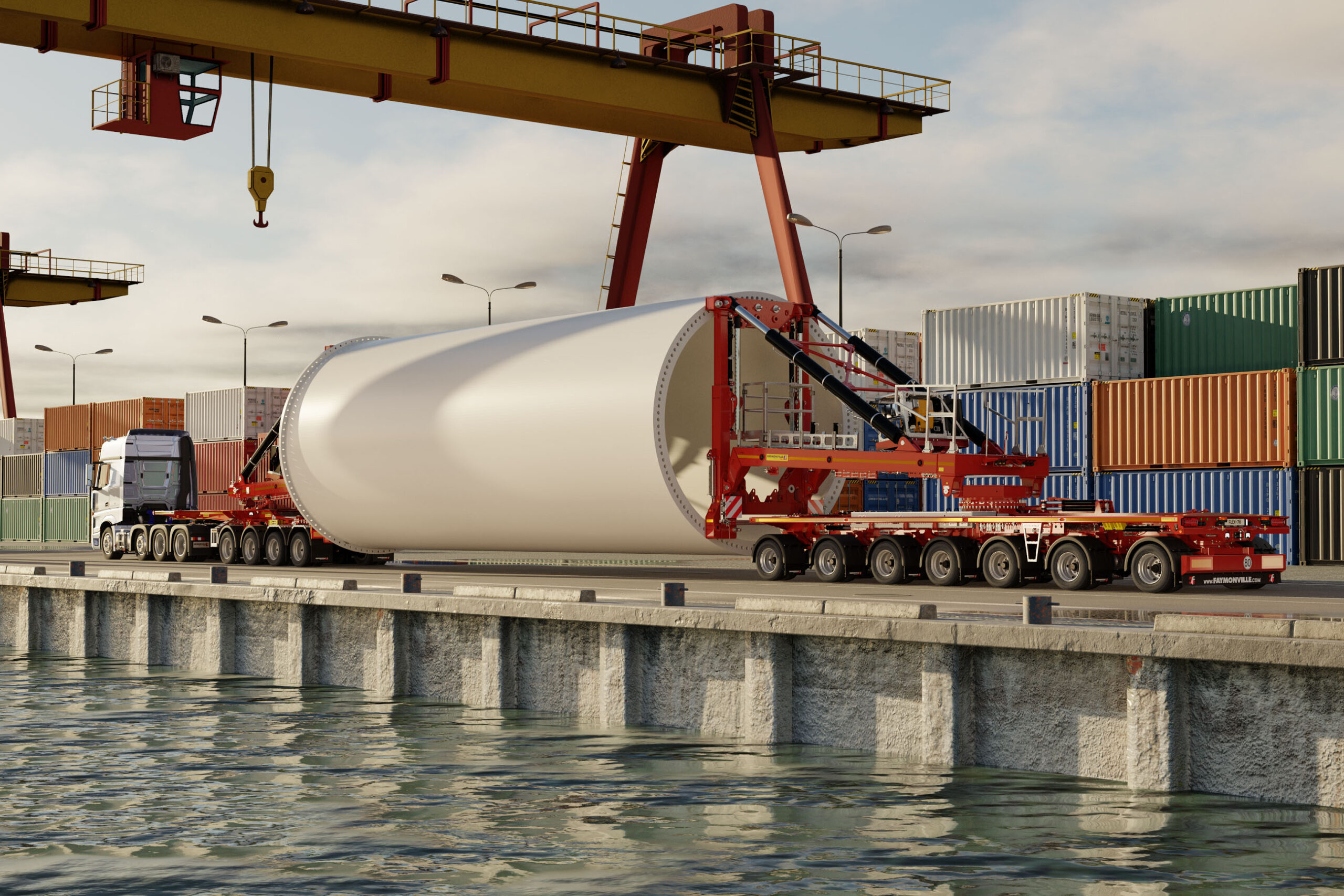 Het transport van onderdelen voor windtorens vereist verschillende oplossingen, afhankelijk van de route. Soms volstaat een ‘klassieke’ dieplader of een semi-dieplader, maar soms is de vereiste veel ingewikkelder. De windtorenadapter met vrij rotatieapparaat, gemonteerd op een 4+7 dolly trailer, vult het laatste hiaat in het assortiment van Faymonville.