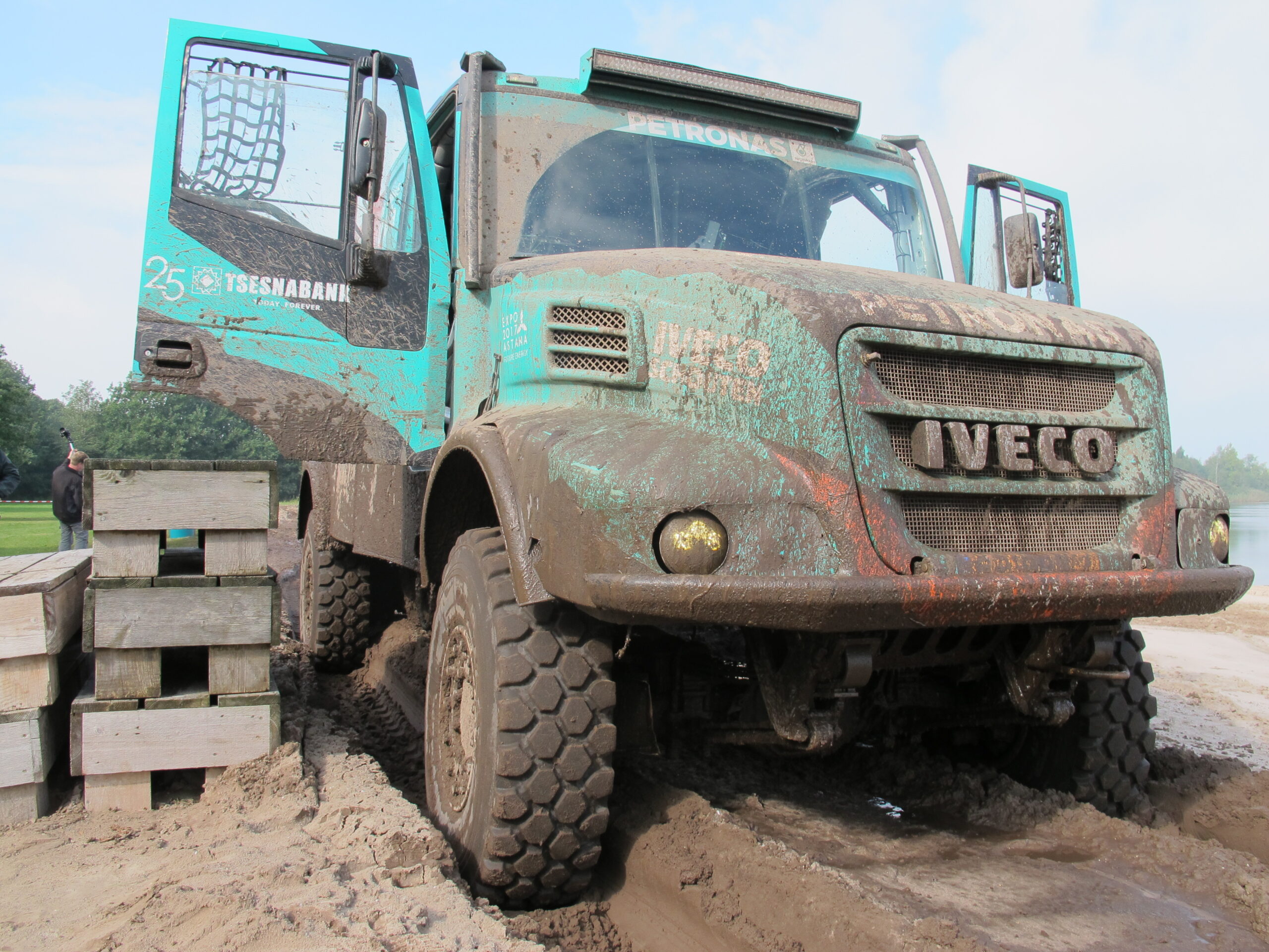 Klanten van de Italiaanse truckfabrikant kregen de gelegenheid op een speciaal voor de gelegenheid uitgezet parkoers te ervaren hoe heftig het er in een cockpit van een Dakar-truck aan toe gaat. Erg heftig dus. Door de zware regenval van de afgelopen dagen was het terrein erg zwaar en blubberig, waardoor zelfs de ervaren De Rooy eenmaal vast kwam te zitten.