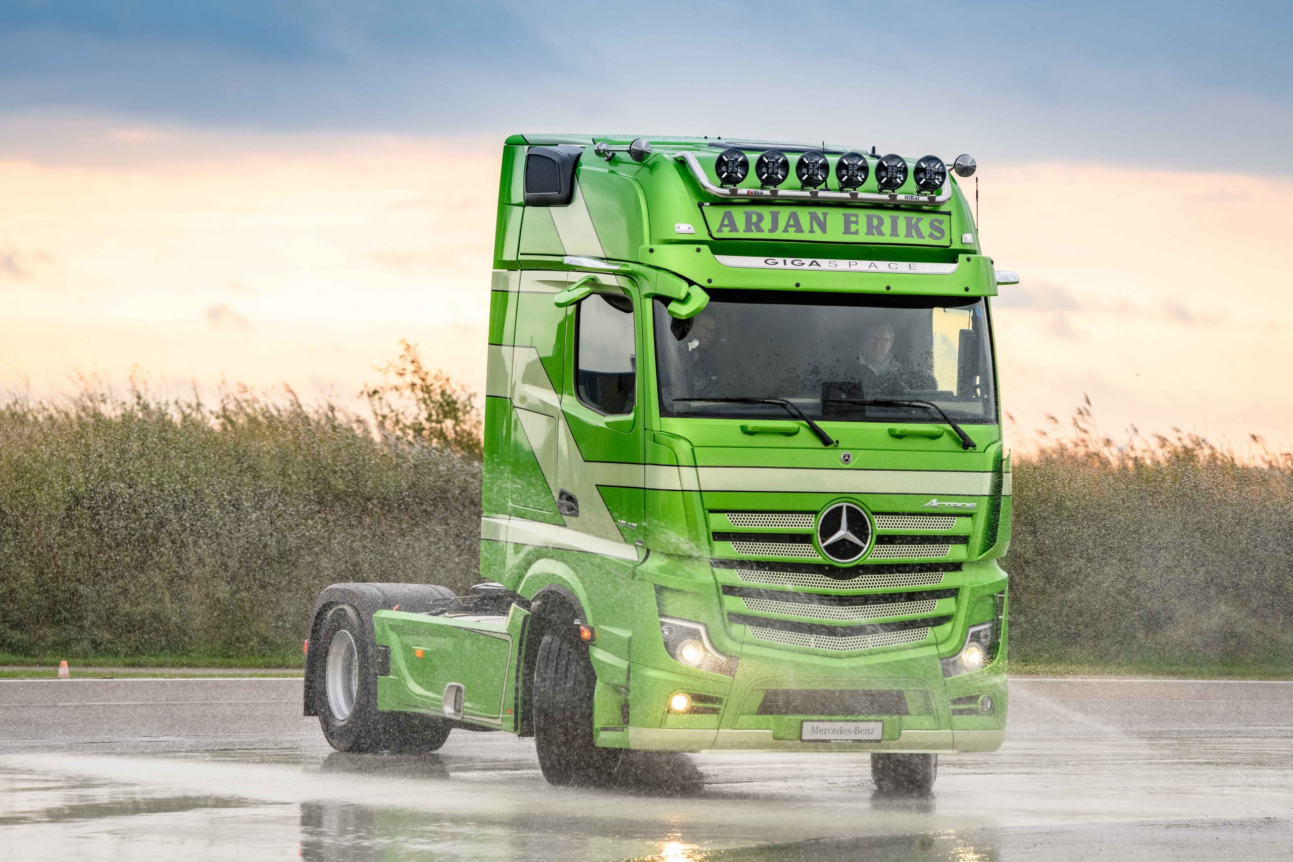 Mercedes-Benz heeft een reputatie hoog te houden en liet onlangs zijn nieuwste snufjes zien op het Rijvaardigheidscentrum in Lelystad. De Duitse truckfabrikant bracht als eerste Active Brake Assist op de markt. De vijfde generatie van de noodremassistent is inmiddels standaard op de Actros. Dit systeem ondersteunt de chauffeur door in bepaalde situaties een noodstop uit te voeren wanneer er stilstaande of bewegende objecten worden waargenomen. Het systeem kan bij een rijsnelheid tot 50 kilometer per uur ook een noodstop uitvoeren of het voertuig afremmen wanneer er bewegende voetgangers worden waargenomen.