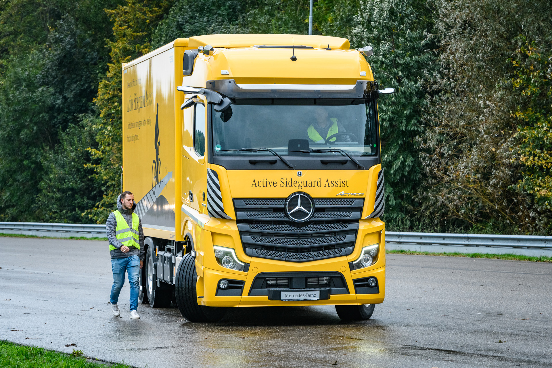 De dode hoek rondom een truck wordt door middel van allerlei systemen steeds kleiner en dat is maar goed ook, want een dodehoekongeval kan zeer gevaarlijk zijn en loopt meestal niet goed af voor de fietser of voetganger. Het systeem van Mercedes doet er alles aan om impact te voorkomen. Active SideGuard Assist ziet het gevaar in de dode hoek en remt de truck vervolgens zelf af tot stilstand. Schakel je de richtingaanwijzer in terwijl er zich iets in de dode hoek bevindt, dan word je als chauffeur eerst gewaarschuwd met een licht- en geluidssignaal. Stuur je vervolgens toch de kant van het gevaar op, dan remt de truck volautomatisch. Wederom een veiligheidssysteem waarvan het goed is om de werking ervan – in een gecontroleerde setting – te ervaren.