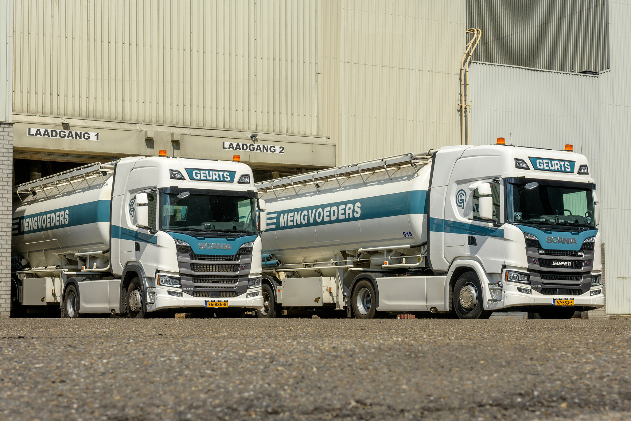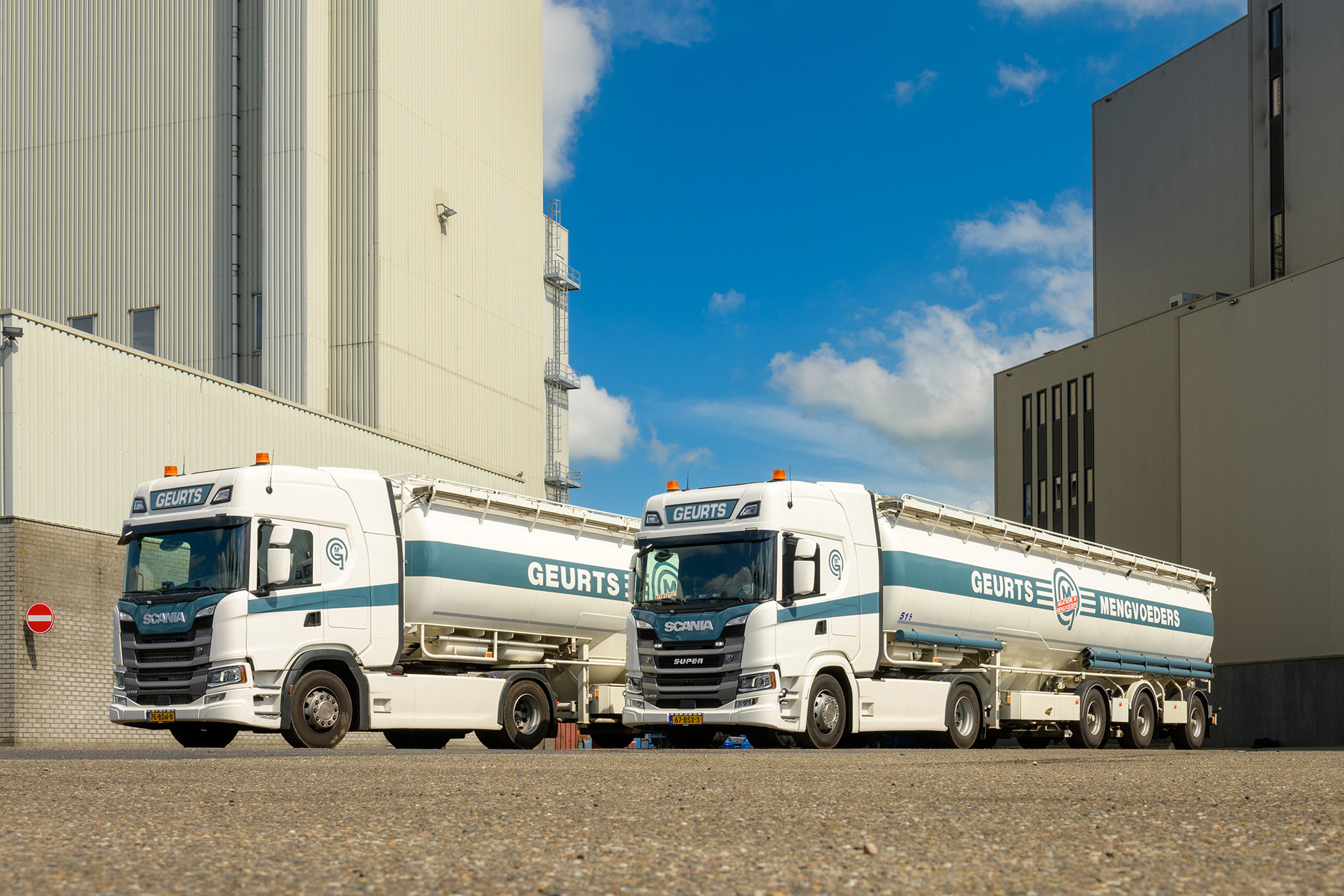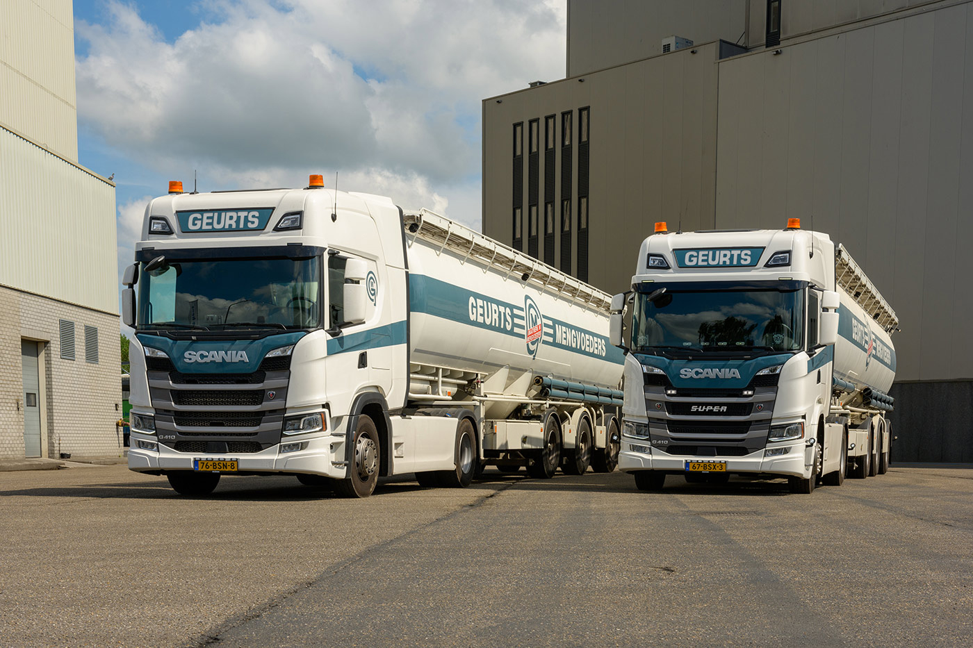 Bolder heeft de nieuwe Scania’s behalve met de LED-verlichting af fabriek ook laten uitrusten met voldoende extra werklampen en camera’s. “Ook de elektro pneumatisch bediende handrem zien wij als een voordeel. De voor ons noodzakelijke compressor is opgebouwd door R.T.I. Transportinstallaties uit Lichtenvoorde en door Cranen Fleetservice uit Heeschwijk Dinther zijn de Scania’s in de bekende Geurts Mengvoeders huisstijl gebracht. En voor het onderhoud hebben we een fullservice contract afgesloten met de Scaniadealer. Die zit zo’n beetje tegenover ons dus dat is lekker dichtbij.”