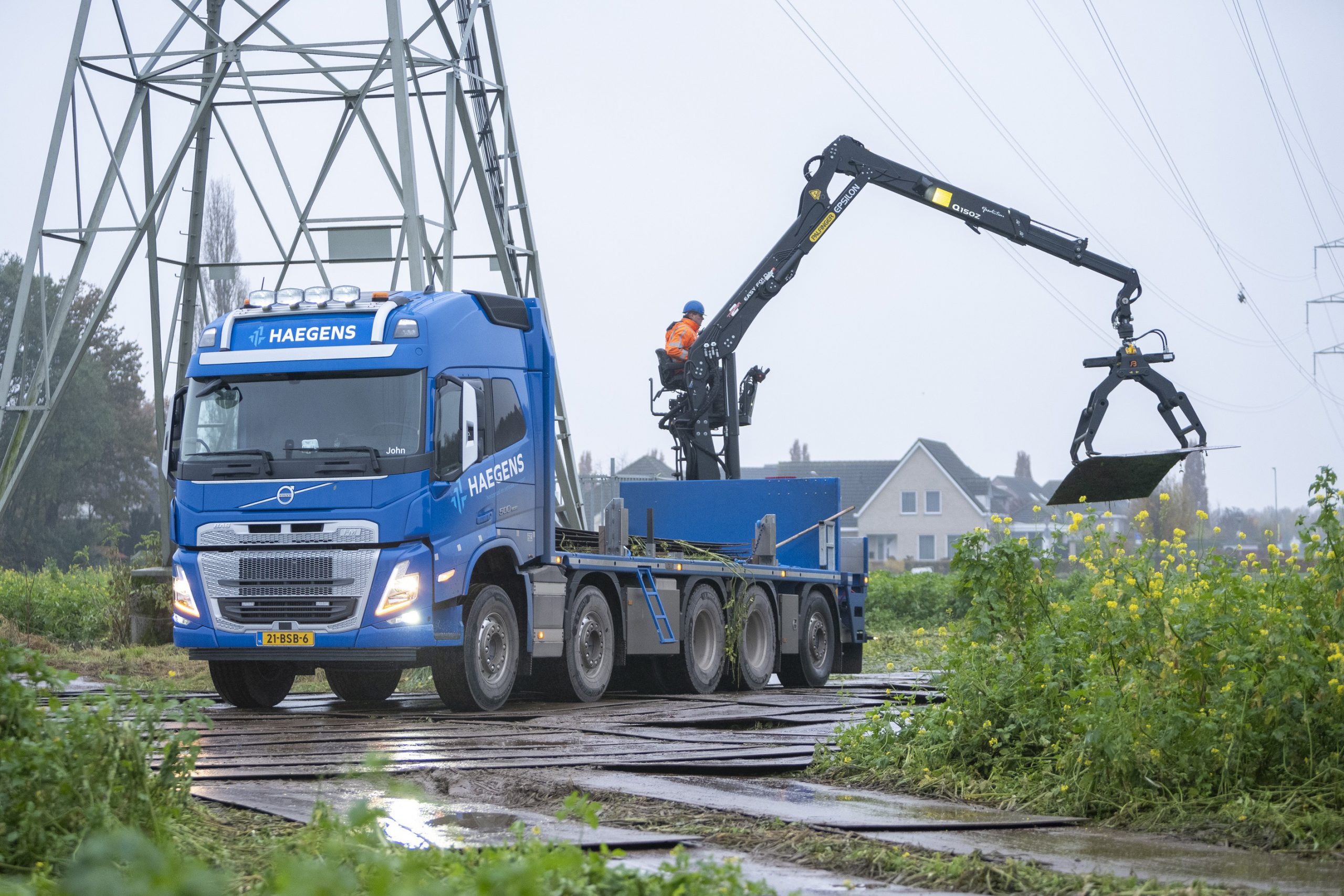 Tot slot heeft Haegens een nieuwe Volvo FM 500 10×4 TAG XL met veertien tonmeter Palfinger Epsilon autolaadkraan aan de vloot toegevoegd. “Deze truck zetten we in voor het transport, uitleggen en opladen van rijplaten. Bij deze truck was laadvermogen voor ons de belangrijkste prioriteit. Onze eis was een netto laadvermogen van ten minste 30 ton zodat we er dertig rijplaten op kunnen laden. BAS Truck Center heeft daarop een TAG XL-asconfiguratie geadviseerd. Daardoor heeft de truck af fabriek een GVW van 49 ton en een netto laadvermogen van ruim 30 ton. Voordeel van deze asconfiguratie is dat Volvo Trucks deze af fabriek kan leveren, zodat er geen aanpassingen aan het chassis hoeven te worden gedaan.” De truck is ook voorzien van naloopas voor optimale wendbaarheid en Drimote, een afstandsbedieningssysteem waarmee de truck op afstand kan worden bestuurd. “Daarmee kan de chauffeur de truck besturen terwijl hij op de kraan zit.”