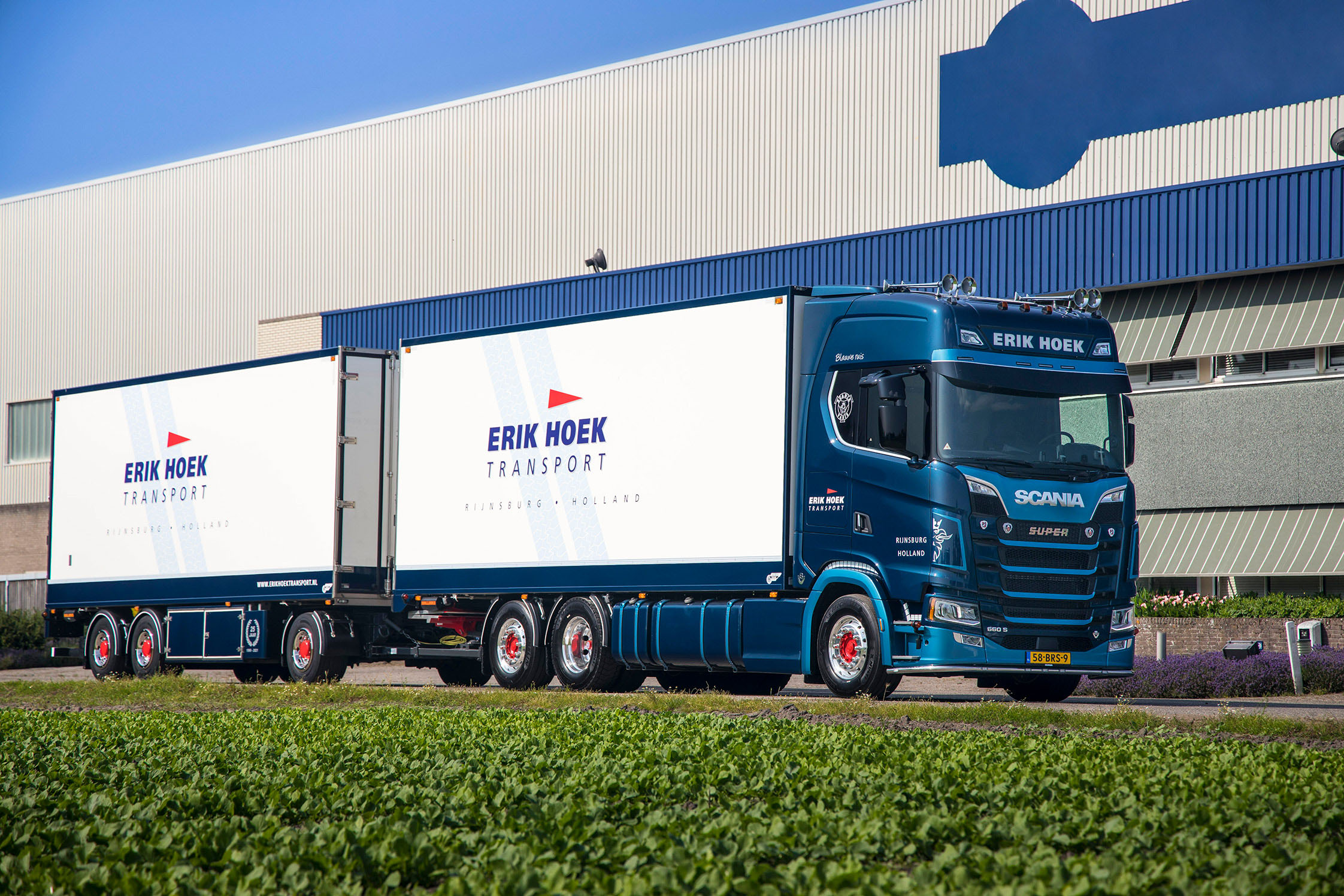 De blauw/witte Scania is met zijn drie-assige aanhangwagen echt nog een klassiek geconfigureerde truck. Erik Hoek: “Wij hebben een uitgesproken voorkeur voor Scania; wij rijden eigenlijk niet anders. Normaal kopen wij geen trucks met S-cabines omdat de instap voor de internationale distributie dan toch wel hoog is. Deze truck is daarop de uitzondering.”