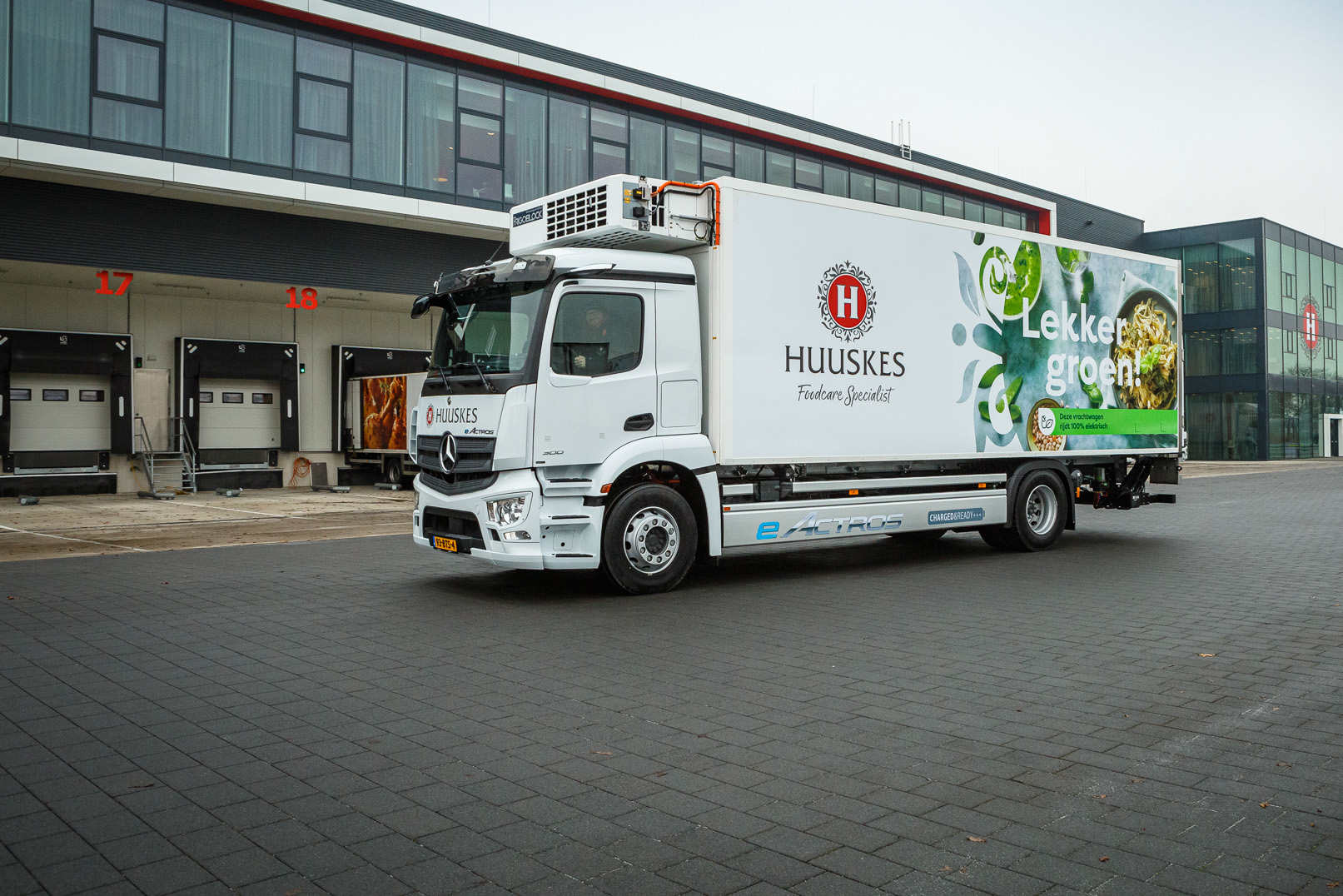 De ingebruikname van de eActros is een logische stap voor Huuskes. Reink: “Ons bedrijf is al jaren actief met het verduurzamen van onze activiteiten en we willen overstappen op elektrische mobiliteit. Wel doen we het liefst zaken met een OEM-fabrikant met een bewezen reputatie op het gebied van service en kwaliteit. Na het vergelijken van het aanbod van verschillende spelers kozen we voor Mercedes-Benz. De eActros is namelijk net wat verder op het gebied van actieradius en technologie en volledig ontwikkeld als elektrische truck. De koeltechnologie is bovendien ontwikkeld in nauwe samenwerking met Frigoblock, een solide aanbieder in dit specialisme. Zo staat er nu een koelwagen die moeiteloos opgenomen kan worden in onze dagelijkse gang van zaken. We beginnen met ritjes dichtbij om straks op te schakelen en de capaciteit van zo’n 250 kilometer elke dag volledig te benutten.”