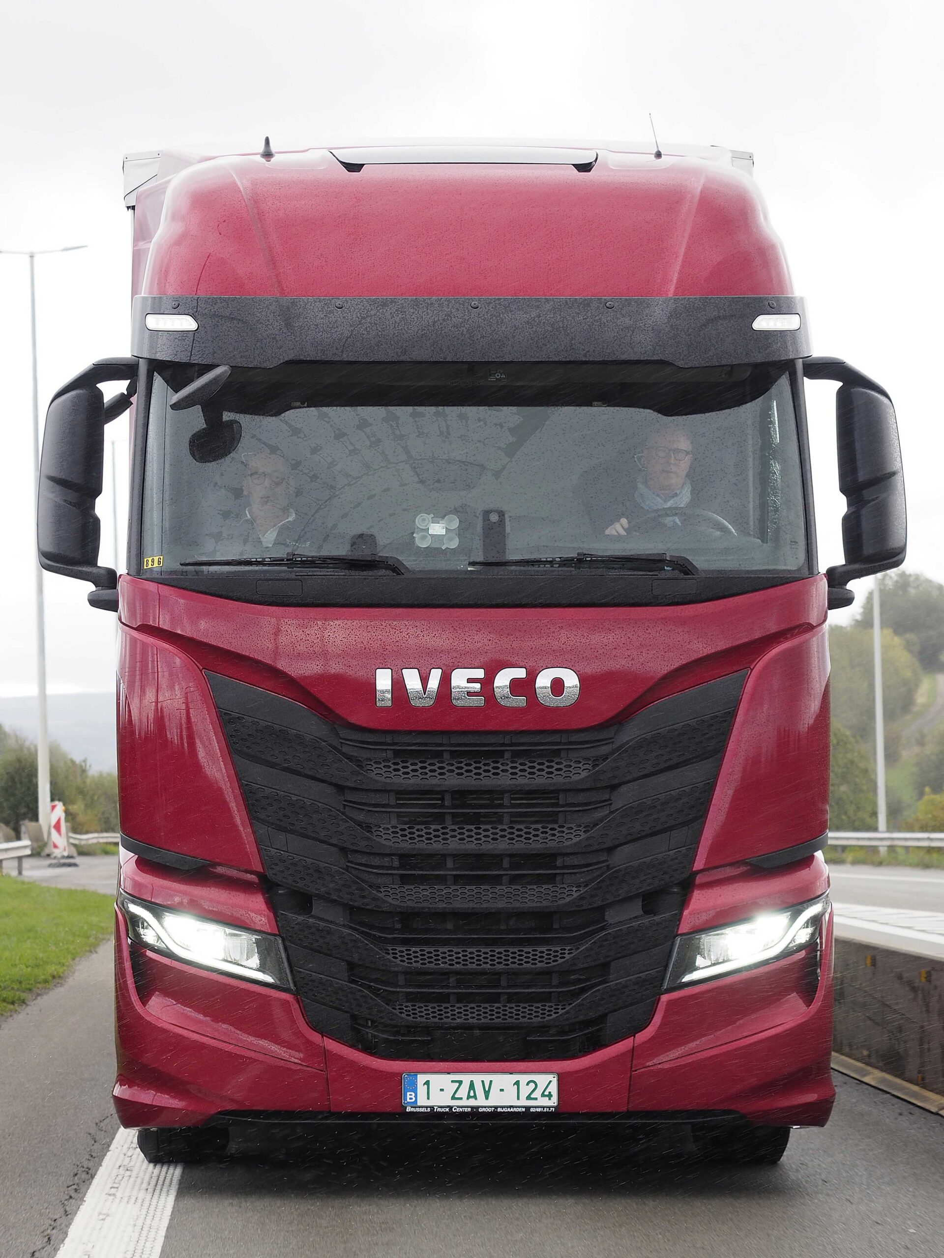 Helaas is het weer op testdag twee bar en boos. Het regent en er staat een stevige wind. Als de Iveco is afgetankt, zetten we rond half tien koers naar ons keerpunt in de Belgische Ardennen. We herontdekken de prettige rijeigenschappen van de S-Way. Zo stuurt hij fijn en blijkt hij ondanks de sterke wind schuin op de auto goed strak in het spoor. De ZF Traxon-versnellingsbak communiceert strak en accuraat met de Iveco-software en is ook lekker vlot.