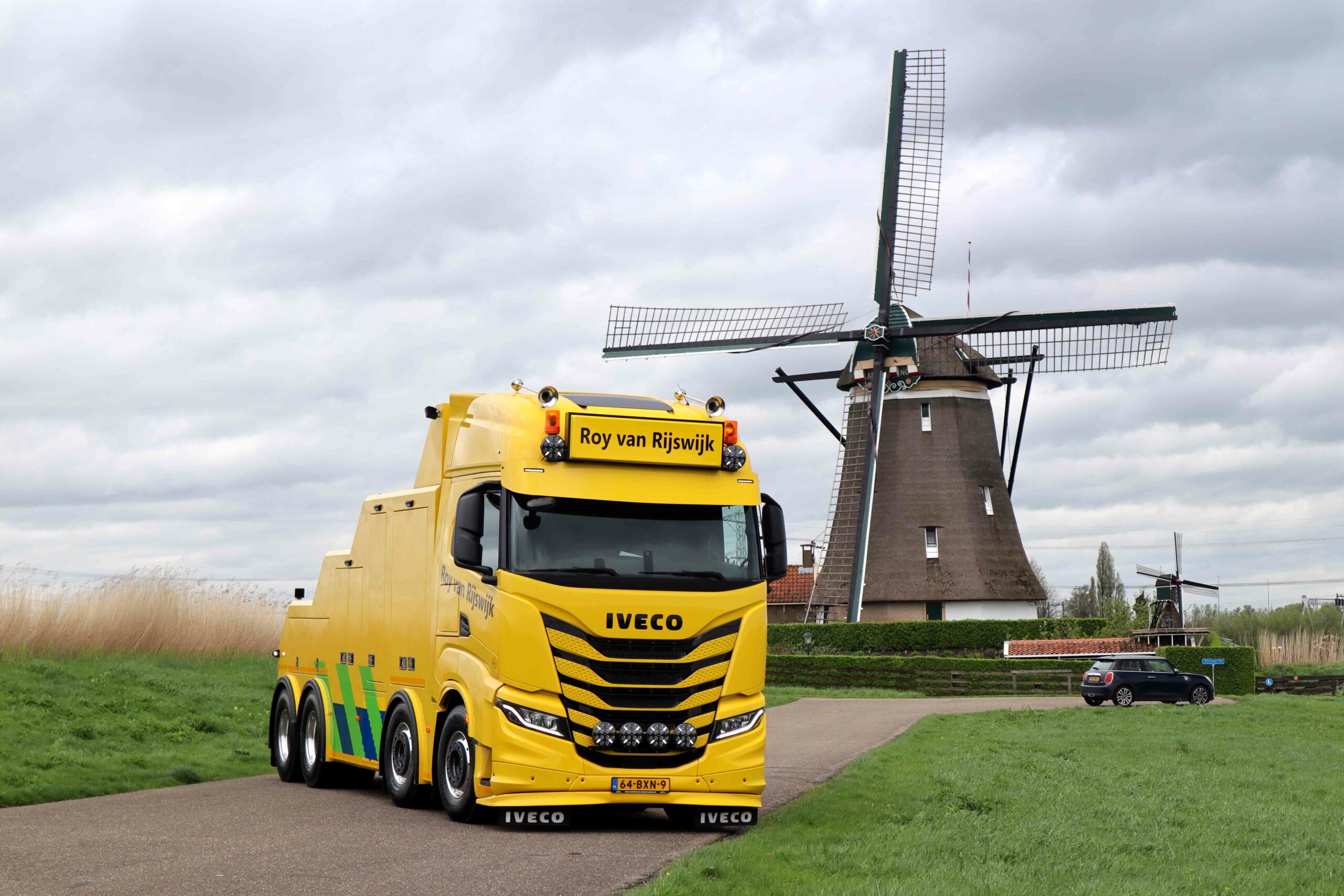 De Iveco X-Way AS360X570PHRON zoals de truck officieel heet, is voorzien van een ruime slaapcabine waarmee de truck ook internationaal inzetbaar is. Het interieur is voorzien van alle luxe, met onder meer het Iveco multimedia systeem en lederen bekleding. Aan de buitenkant werd de truck verfraaid met een extra onderspoiler, een diepere zonneklep en een stoere lichtbak. Voor Roy van Rijswijk is het de eerste Iveco in de vloot. “Ik vind het gewoon een mooie truck en dit chassis is precies wat wij zochten. Bovendien is het nu een uniek exemplaar, want ik heb in heel Europa nog geen tweede X-Way 8×4 gezien als bergingstruck”, besluit Roy.