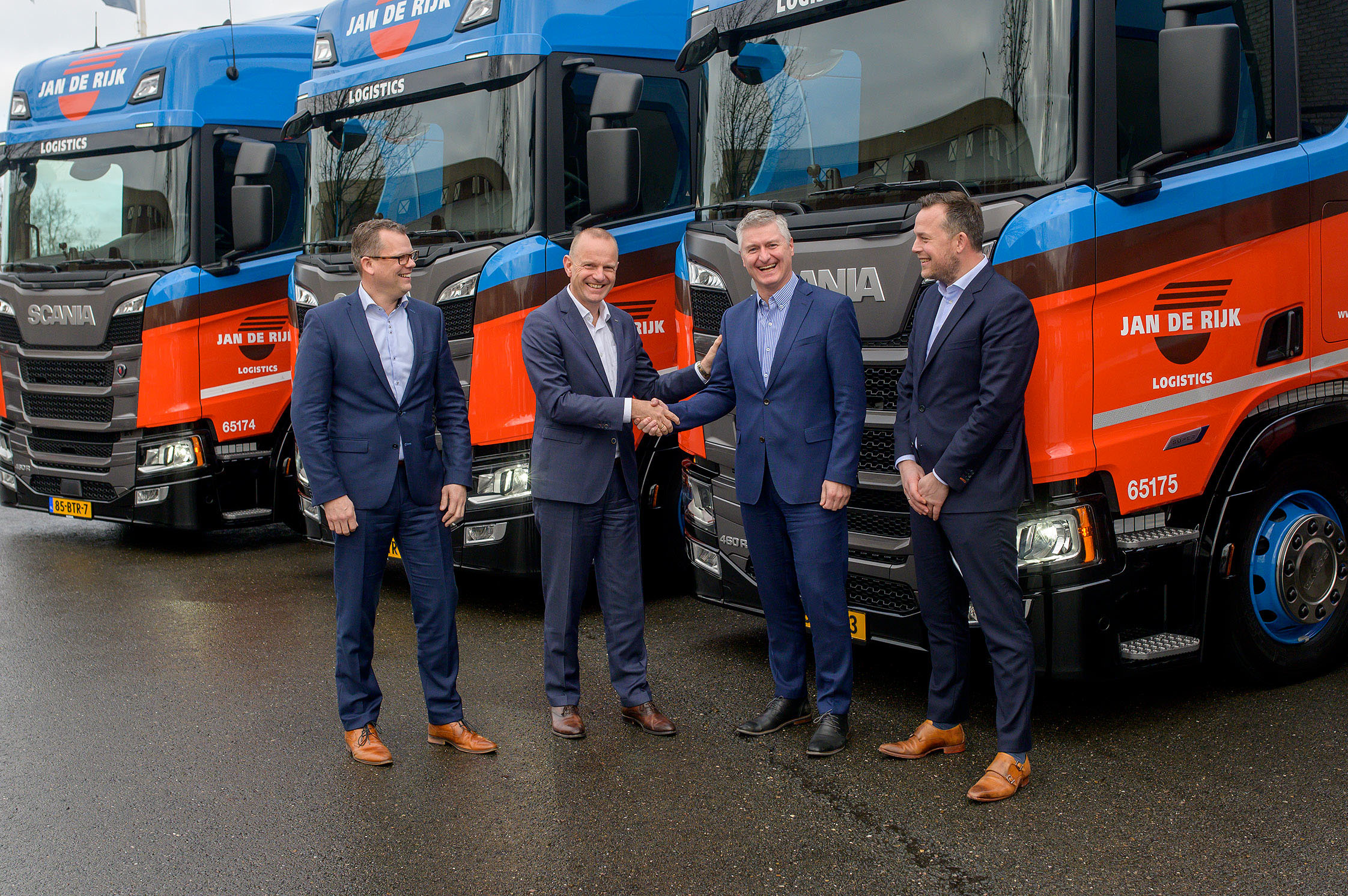 - Op de foto v.l.n.r. Jan-Willem Grinwis (regiodirecteur Scania Zuid-West), Janko van der Baan (managing director Scania Benelux), Fred Westdijk (CEO Jan de Rijk) en Daniel Uijtdewillegen (director international transport Jan de Rijk).