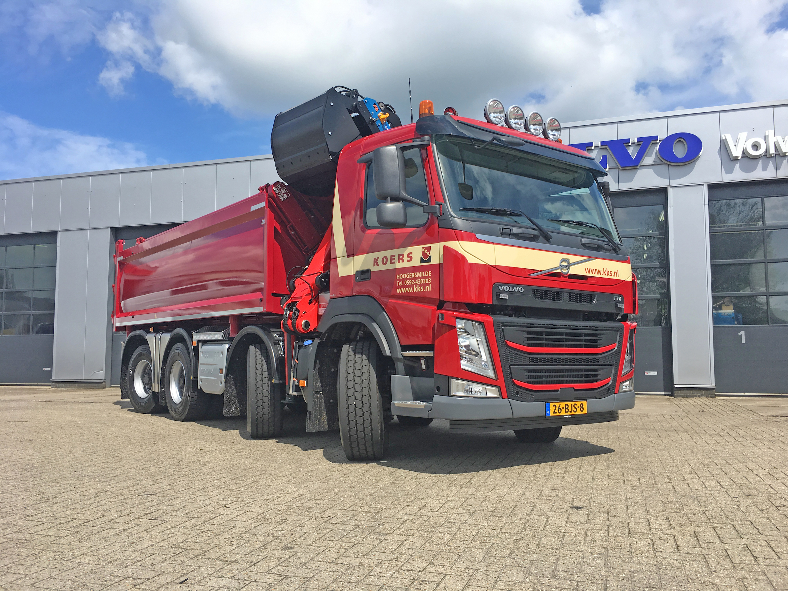 De onderneming uit Hoogersmilde zegt voor de Volvo te hebben gekozen vanwege het veelzijdige karakter van de truck. ,,Met de tweezijdige kieper kunnen we grondstoffen zoals zand en puin zowel achterover als zijwaarts lossen’’, zegt mede-eigenaar Klaas Koers. ,,De 20 tonmeter Palfinger-kraan kan allerhande hijswerk aan, zoals betonnen stapelblokken en bigbags met teelaarde of compost. Maar ook onze grondverzetmachines die de Volvo FM op een dieplader kan meenemen.”