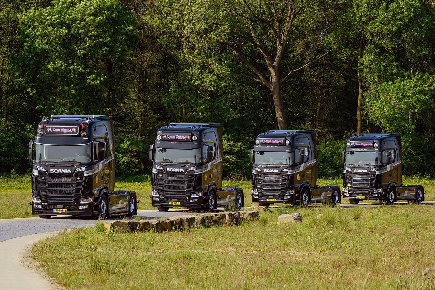 Laura Hagens Transport neemt dit jaar nog 13 nieuwe Scania 4×2 trekkers in gebruik. Het gaat om zeven stuks 530S met V8-motor en zes 500S met Scania’s nieuwste Super-motor. Alle trucks zijn voorzien van een hydrauliekpomp, een negentons vooras en luchtvering rondom.