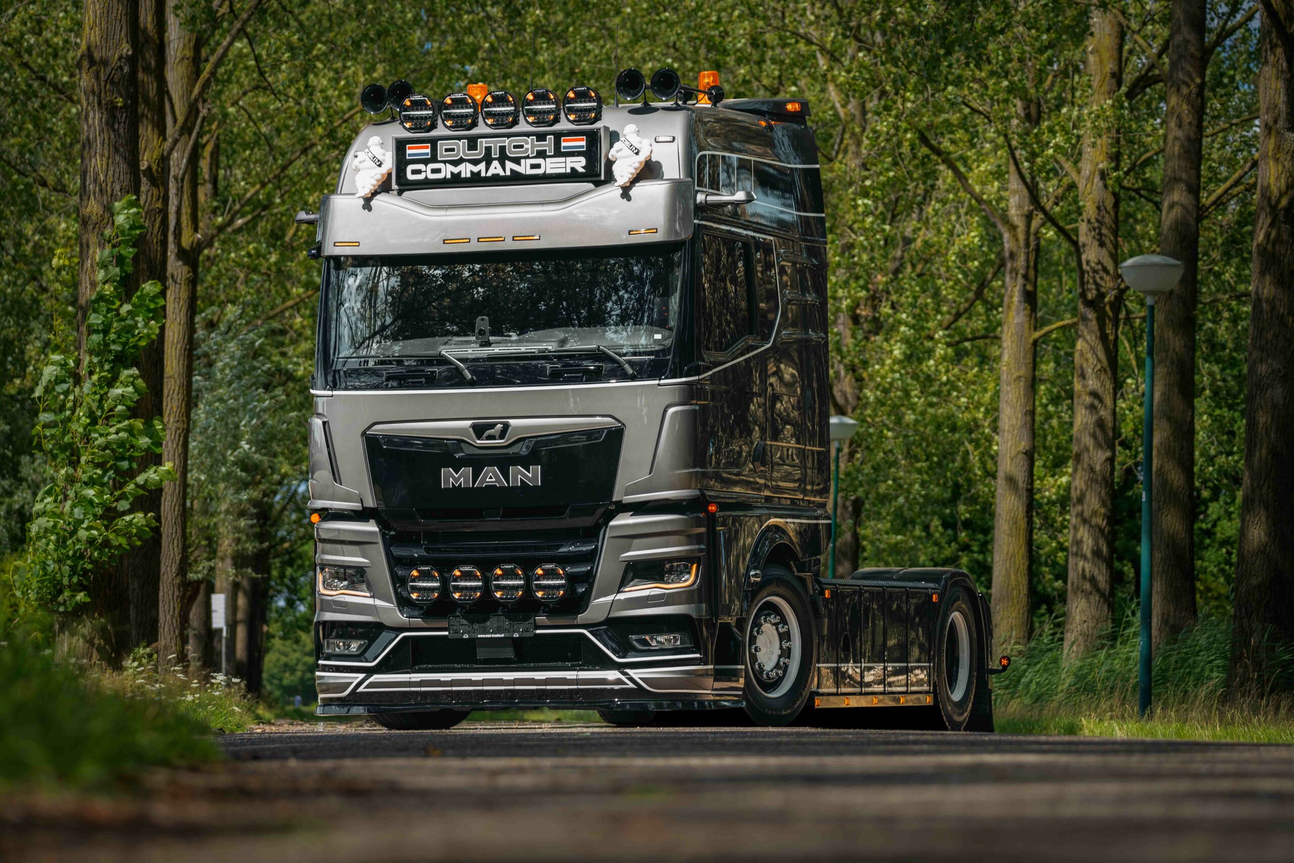 De basis van de TGX ‘Dutch Commander’ is een luchtgeveerde MAN TGX 18.510 4×2, voorzien van de ruime GX cabine. Voor de transformatie naar de zo geliefde ‘Dutch Style’ is deze TGX uitgerust met een Deense bumper, skirts met tankbanden en een volledig dichte vlonder. Andere eye catchers zijn de custom made uitlaten, het slangenrek met verlichting en een lichtlat onder de spoiler. Ook de voorzijde van de truck is stevig onder handen genomen, met een op maat gemaakte bumperspoiler en een vernieuwde variant van de verlengde zonneklep, dit keer zonder zichtbare bevestigingsbouten. Die geven deze TGX een extra stoere aanblik. De oldschool lichtbak met Michelin-poppen, de Lazer Sentinel verstralers en de vier Nedking luchthoorns maken het geheel af.