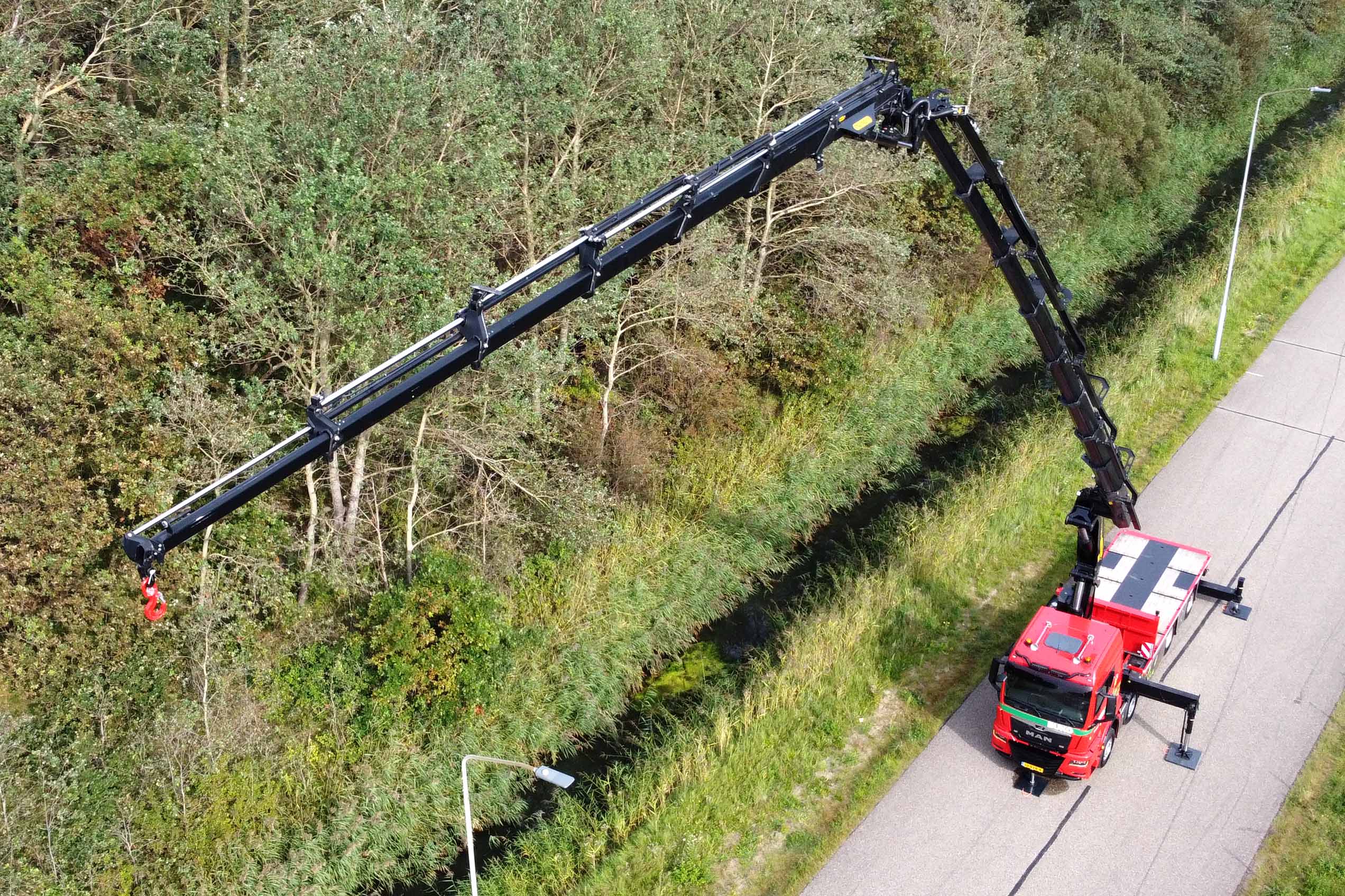 De Palfinger autolaadkraan heeft een bereik van 37 meter. Wouter Langendijk: “Bijkomend voordeel van elektrische kranen is dat de chauffeur dankzij de stilte op het werk nu nog beter kan communiceren met de dakdekkers en omstanders. Dat zorgt voor rust en meer veiligheid.”