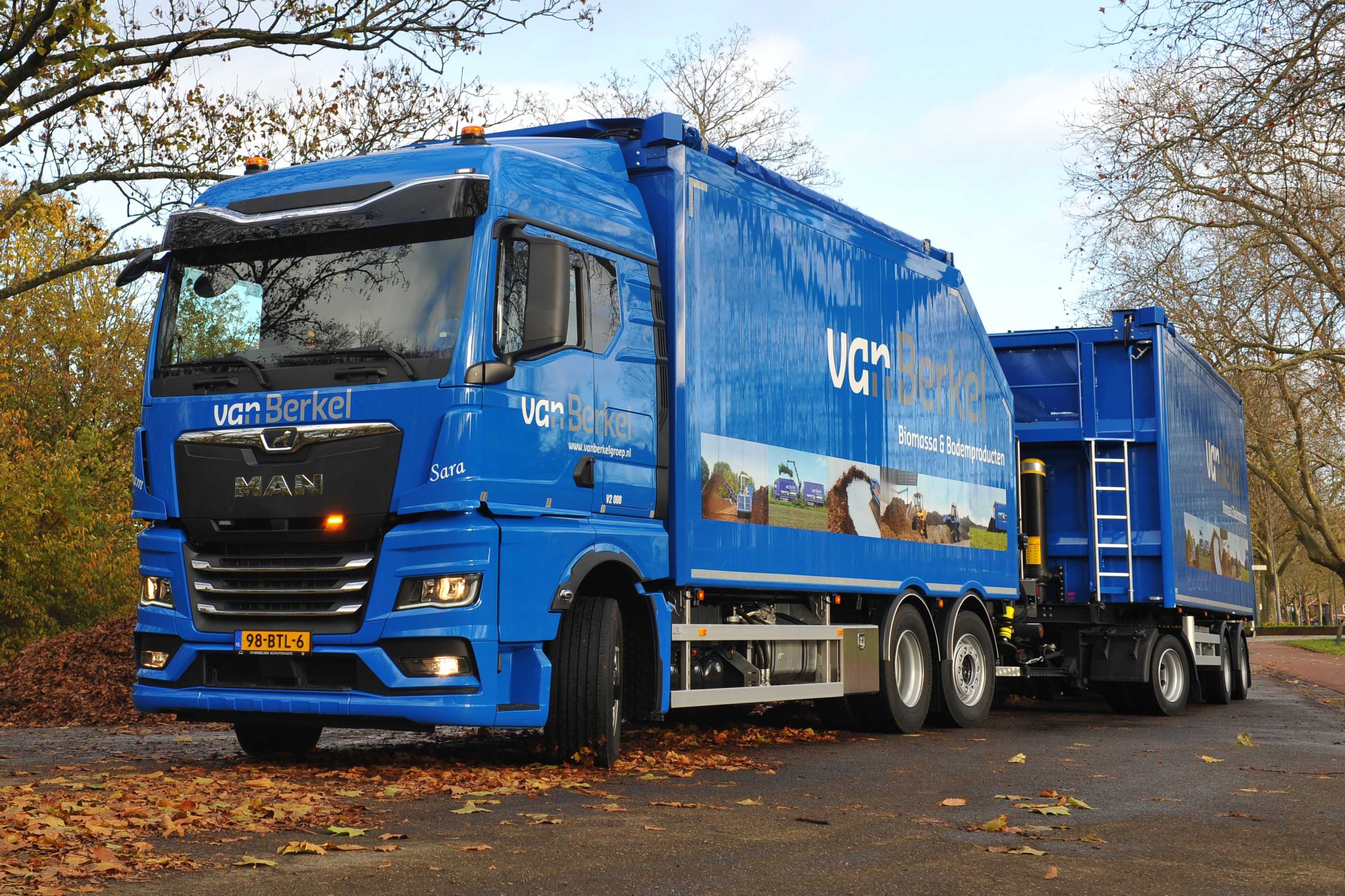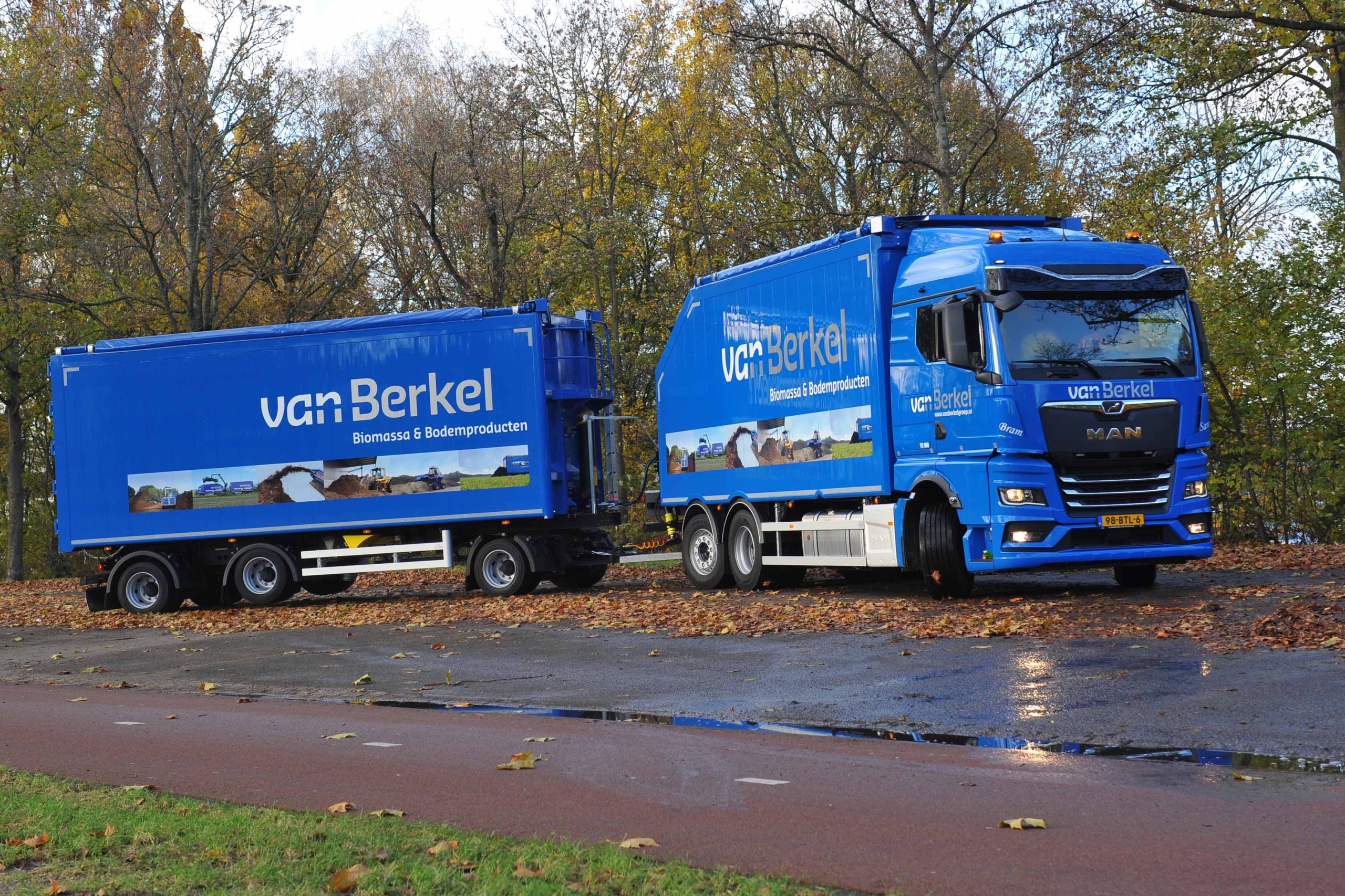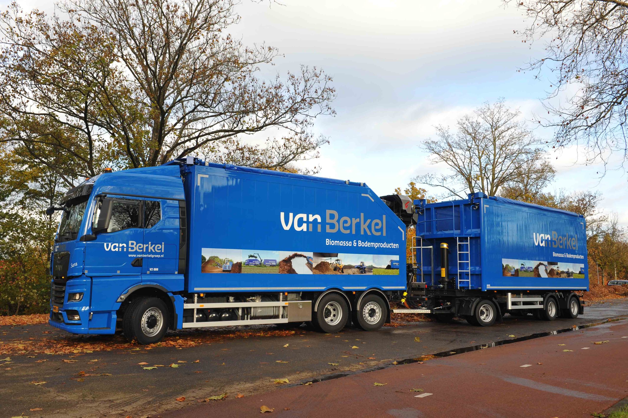 De nieuwe MAN met hydrodrive rijdt voor Van Berkel Biomassa & Bodemproducten. “De chauffeur is dagelijks in Brabant onderweg en pakt met een kraan allerhande ladingen op die klaar liggen. Denk aan snoeihout, bermgras, slootmaaisel en herfstbladeren.” Van Berkel beschrijft hoe de chauffeur met de laadkraan eerst de aanhangwagen vollaadt. “Op de kraan kan hij zien hoe hij zit met de aslasten. Is de aanhanger aan het gewicht, dan gaat de rest in de motorwagen.”